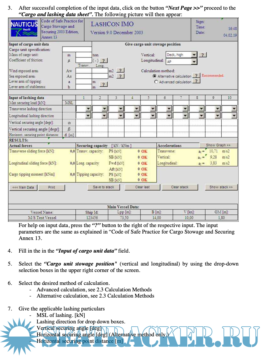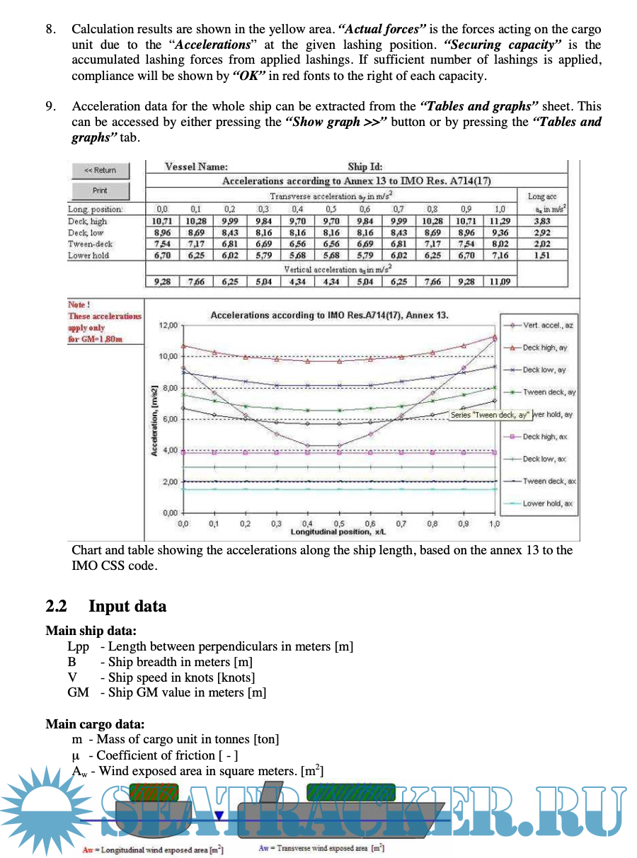 The program calculates accelerations and balance of forces in semi- and non-standardised lashing arrangements in accordance with annex 13 to the Code of Safe Practice for Cargo Stowage and Securing (the CSS code) from IMO.