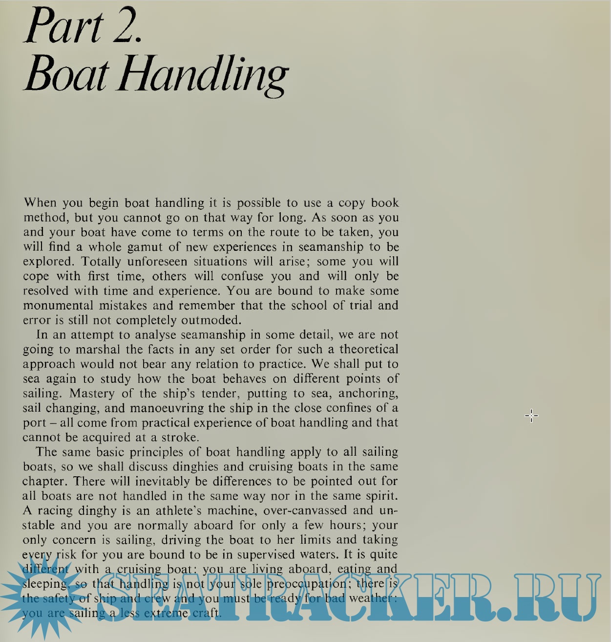 Year: 1982 Language: english Author: James MacGibbon Genre: Manual Publisher: Sail Books Edition: First ISBN: 0-914814-10-9 Format: PDF & EPUB & DOCX Quality: Scanned pages Pages count: 803 Description: From Introduction This new Glenans Sailing Manual, following on the sailing courses we brought out over ten years ago, is a collective work produced by instructors and skippers at Les Glenans. Each chapter is the result of much critical discussion and careful checking. Some have contributed more than others, but no one wished to be singled out from the name which unites us all - Glenans. The course is a synthesis, neither an encyclopedia, nor a mere compilation. We have only included what seems to be essential in the experience of succeeding generations of sailors and instructors - during more than a quarter of a century at Glenans. Our aim is to enable the beginner virtually to learn on his own. Les Glenans only claims to offer the right background to those who really want to learn how to sail, and is no narrowly structured school with examinations and diplomas. By the same token our manual aims to give friendly encouragement and allay your anxieties without, we hope, forgetting to warn you of the dangers. The approach, at least in the beginning, applies equally to someone working alone and to a crew of two, and that is why, for instance, there is no mention of that maid-of-all-work at sailing schools, the Caravelle, because it is not a boat for a beginner on his own. We hope too that the manual will be useful to those who have already done some sailing as a means of checking and extending their knowledge, and getting real feeling for the whole business. It is in fact quite a comprehensive work. The experience of many seas - from the North Cape to the Canaries, from Ireland to the coast of Poland, from Gibraltar to Turkey - has enabled Glenans skippers to broaden their knowledge and pass it on. But certain subjects, like astro-navigation for instance, are not covered since we consider that there are already excellent books on that subject and we have nothing to add.