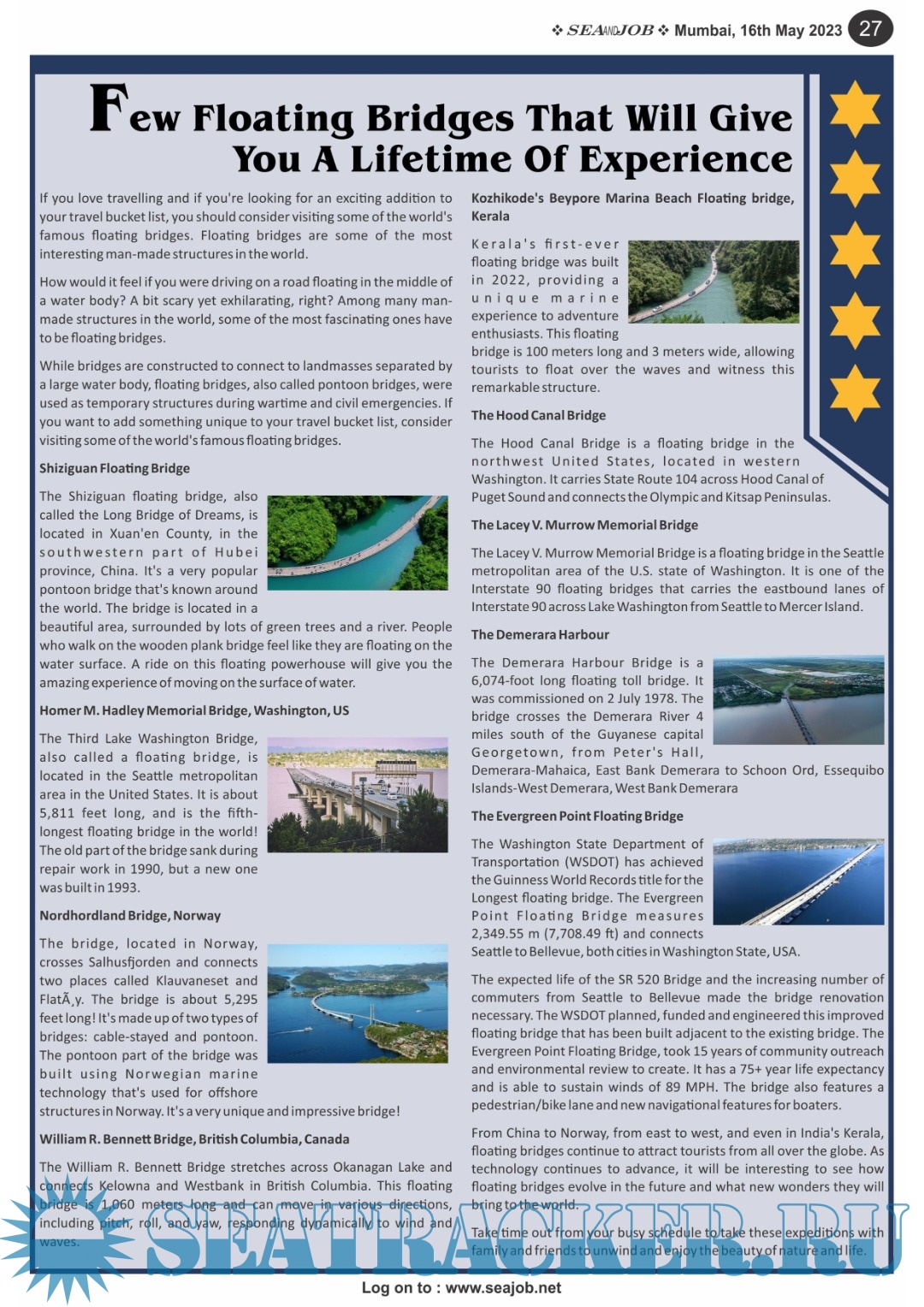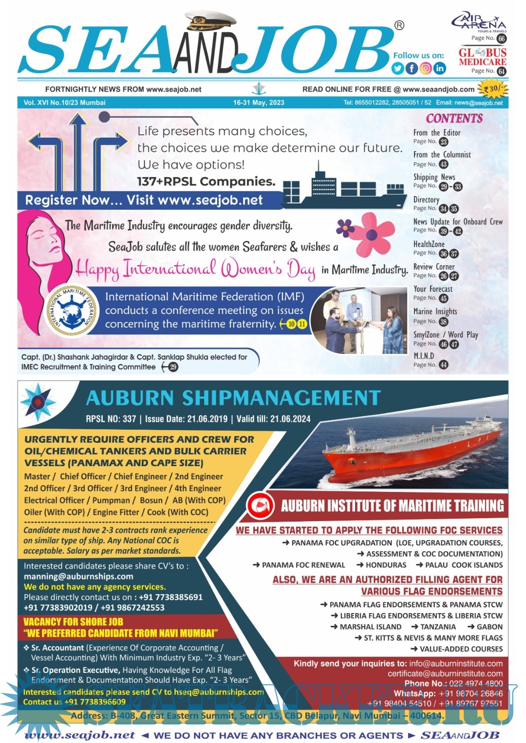 Description: The Sea and Job magazine launched in May 2007, was the second venture of Sea Line Group succeeding 'seajob.net' bringing the much renowned essence to the Group, the Sea and Job Magazine quickly gained popularity, becoming the No. 1 Shipping Magazine that came to be widely circulated all over India. Sea and Job over the years has evolved as the most trusted, ethical, objective and read maritime publication that possesses a large database of subscribers from various verticals in the industry.The magazine provides informative and interesting articles covering not just the shipping world but also the world outside it.Sea and Job is also a medium for the shipping/ manning companies to advertise marine jobs and also to promote their organization by publicizing internal activities like seminars, sports events and parties.Some notable endeavors of the magazine include the Know Your Recruiter Column, the Sailing Episodes Column and the Marine Insights section. The consistent efforts and the dedication to provide extraordinary services to the industry has resulted in the magnifying popularity and patronage of Sea and Job.