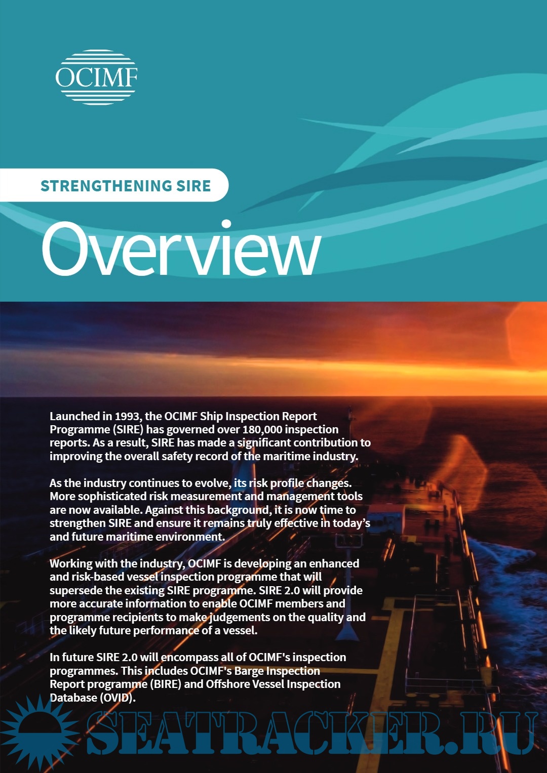 One of the most significant safety initiatives introduced by OCIMF is the Ship Inspection Report Programme (SIRE). This programme was originally launched in 1993 to specifically address concerns about sub-standard shipping. The SIRE Programme is a unique tanker risk assessment tool of value to charterers, ship operators, terminal operators and government bodies concerned with ship safety.