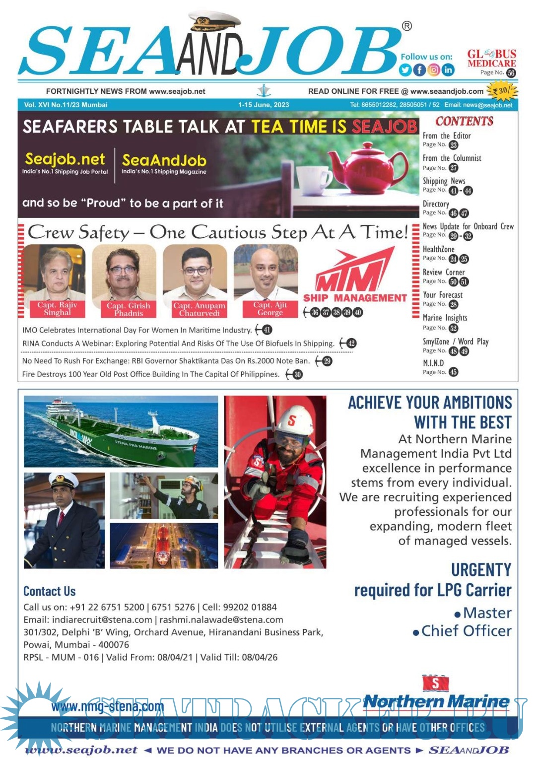 Description: The Sea and Job magazine launched in May 2007, was the second venture of Sea Line Group succeeding 'seajob.net' bringing the much renowned essence to the Group, the Sea and Job Magazine quickly gained popularity, becoming the No. 1 Shipping Magazine that came to be widely circulated all over India. Sea and Job over the years has evolved as the most trusted, ethical, objective and read maritime publication that possesses a large database of subscribers from various verticals in the industry.The magazine provides informative and interesting articles covering not just the shipping world but also the world outside it.Sea and Job is also a medium for the shipping/ manning companies to advertise marine jobs and also to promote their organization by publicizing internal activities like seminars, sports events and parties.Some notable endeavors of the magazine include the Know Your Recruiter Column, the Sailing Episodes Column and the Marine Insights section. The consistent efforts and the dedication to provide extraordinary services to the industry has resulted in the magnifying popularity and patronage of Sea and Job.