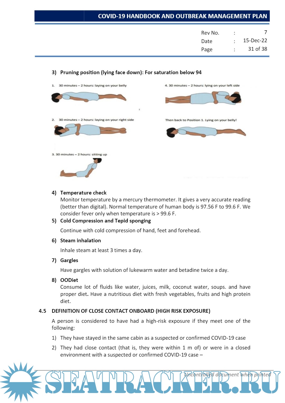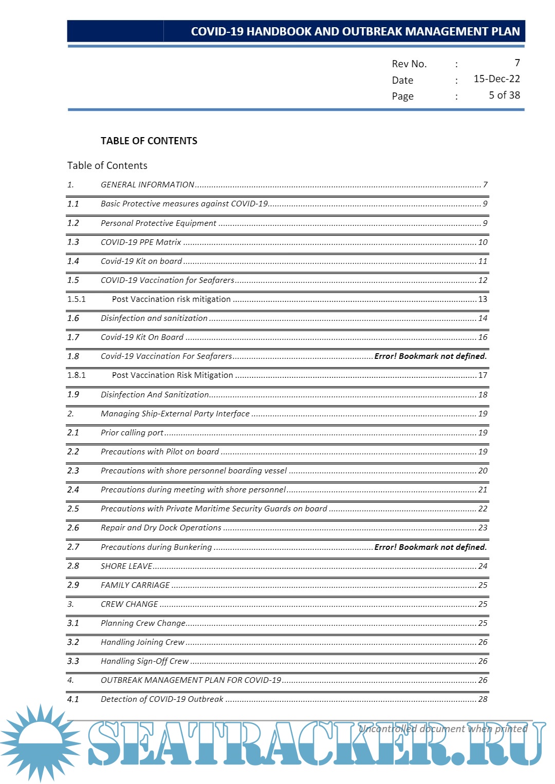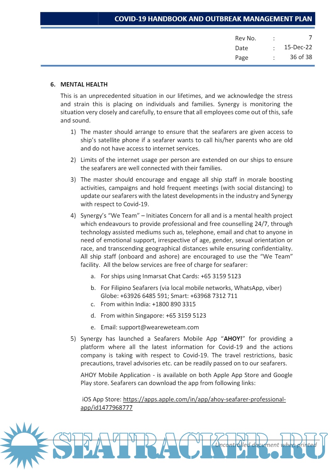 Description: This Covid-19 handbook and outbreak management plan provides procedures to be put in place to prepare Synergy ships for ‘ship-shore” interface and to protect our seafarers from the dangers posed by the new Coronavirus disease (Covid-19). These includes potential exposure from shore personnel and the actions to be taken in the event of a suspected case on board.