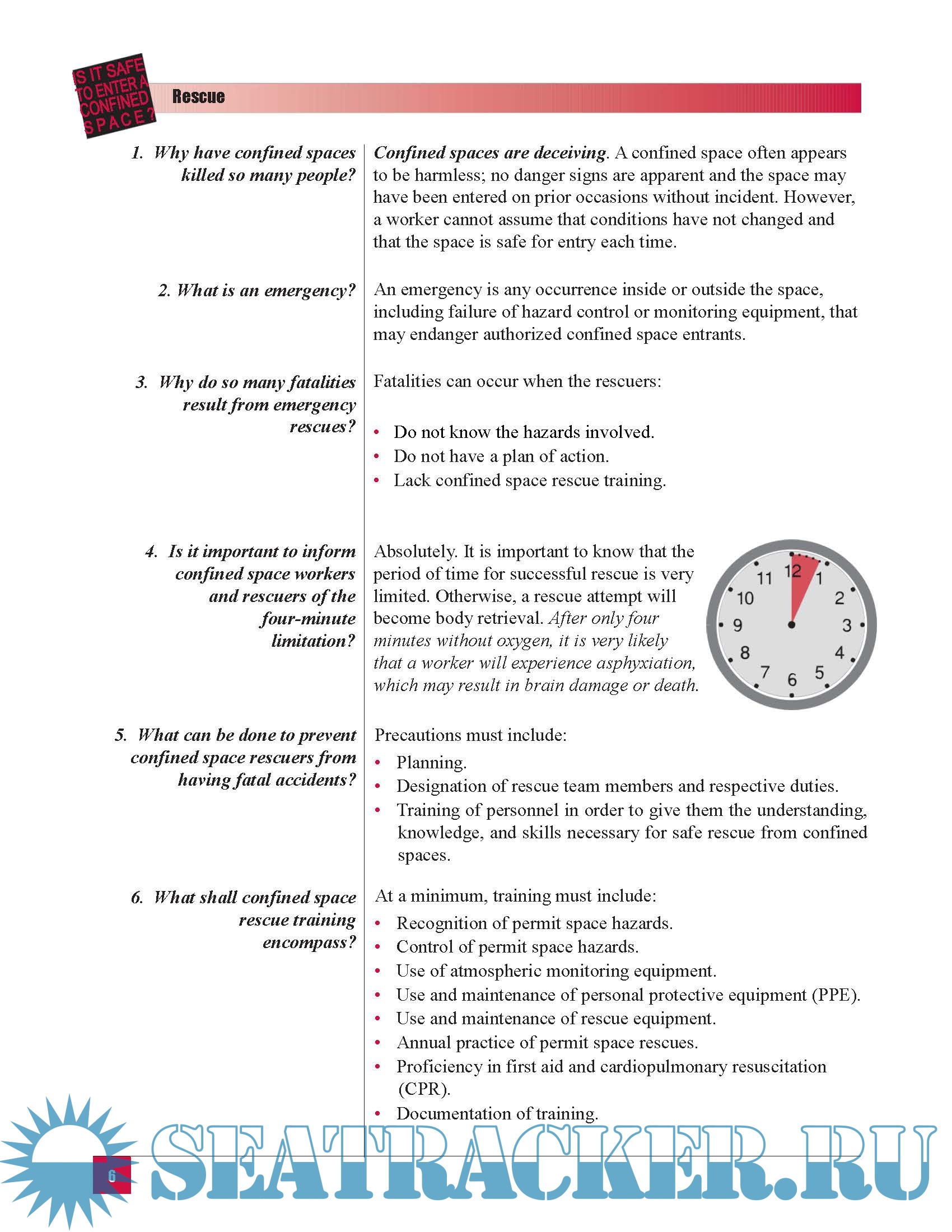 Regulatory Requirements 1 .................................................................................................................... Introduction 2 .......................................................................................................................................... Fatal Facts 4 ............................................................................................................................................. Rescue 5 .................................................................................................................................................... Emergency 6 ........................................................................................................................................ Self-Rescue, Non-Entry, and Entry Rescue 7 ...................................................................................... Rescue Training and Plan 8 ................................................................................................................. On-Site Rescue Team vs. Off-Site Rescue Team 9 .............................................................................. Rescue Equipment 11 .......................................................................................................................... Definitions and Basics 13 ........................................................................................................................ General Terminology Confined Space; Immediately Dangerous to Life or Health (IDLH); Permissible Exposure Limits (PEL); Entry 14 ...................................................................................................................... Permit Evaluation Permit-Required vs. Non-Permit Confined Space; Space Reclassification; Alternate Procedures; Permit-Required Confined Space Program (Hot Work and Host Employer-Contractor) 17 ........................................................................................................................... Confined Space Hazards 24 .................................................................................................................... Atmospheric Hazards Oxygen Deficiency/Enrichment; Combustible/Flammable/Explosive Gases and Vapors; Combustible Dust; Toxics; Safety Data Sheets (SDS); Monitoring-Air Sampling and Equipment 25 ..................................................................................................................... Physical Hazards Mechanical; Entrapment; Engulfment; Other Types of Hazards 33 ............................................................................................................................. Hazard Controls 35 ................................................................................................................................ Controls for Atmospheric Hazards Ventilation; Respiratory Protection; Other Control Measures 36 ................................................................................................. Controls for Physical Hazards Isolation (Mechanical, Electrical, Pressurized Lines, Ducts, or Pipes); Other Control Measures 38 ........................................................................................................ Personal Protective Equipment and Tools 40 ...................................................................................... Communication System 41 ..................................................................................................................