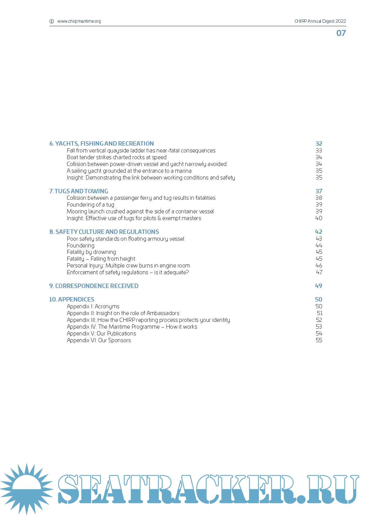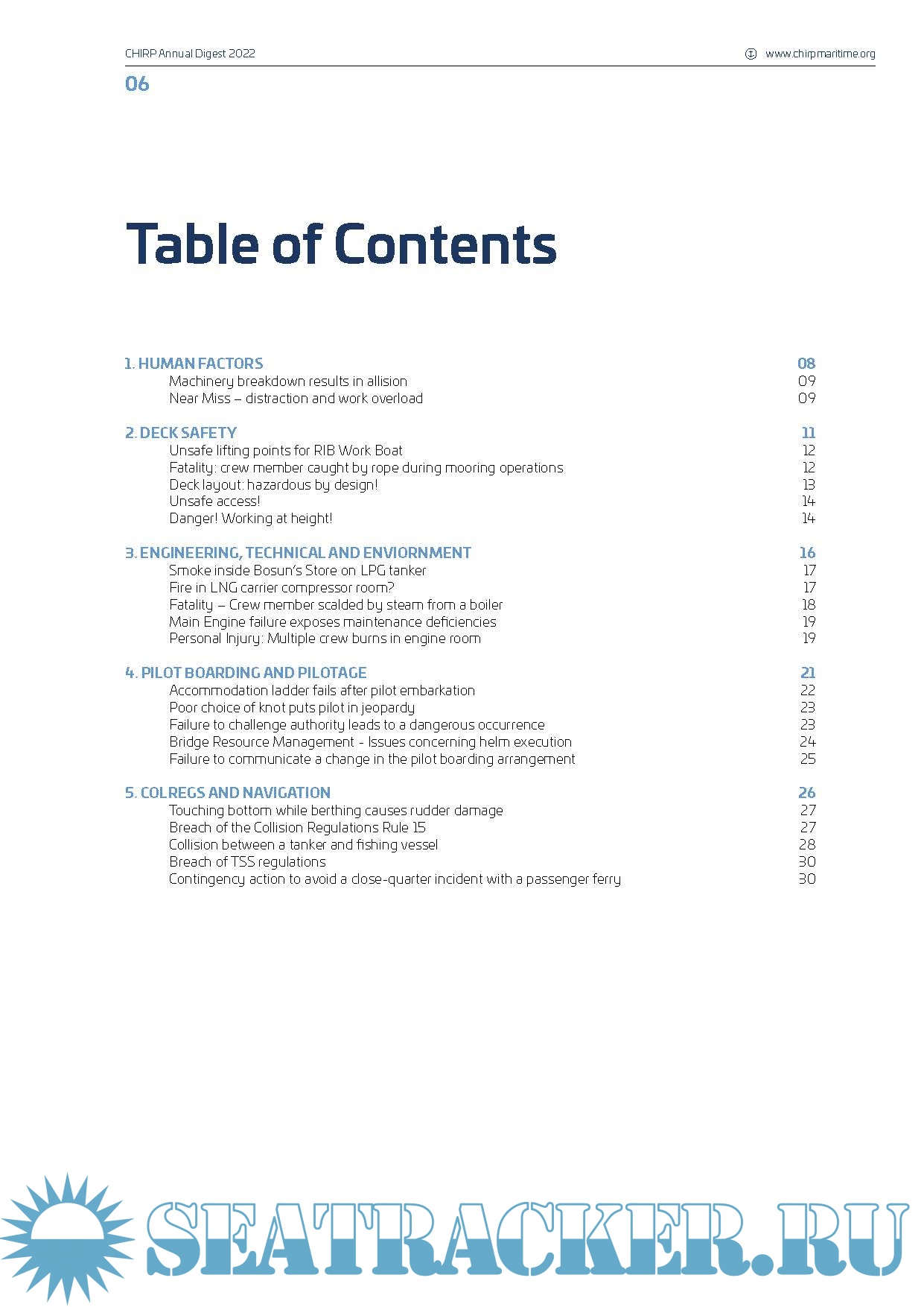 Year: 2023 Language: english Author: CHIRP Maritime Genre: Periodical Format: PDF Quality: eBook Pages count: 70 Description: This publication contains summaries of all cases published by CHIRP (Confidential Human Factors Incident Reporting Programme) during 2022. CHIRP Maritime aims to improve maritime safety by providing an independent and confidential reporting system for all individuals employed in or associated with the industry, analysing data and identifying safety trends and informing the community of safety related reports and trends. The Digest categorises incidents according to human factors, deck safety, engineering, technological, environmental, pilotage, COLREGs/navigation, safety culture and health and etc