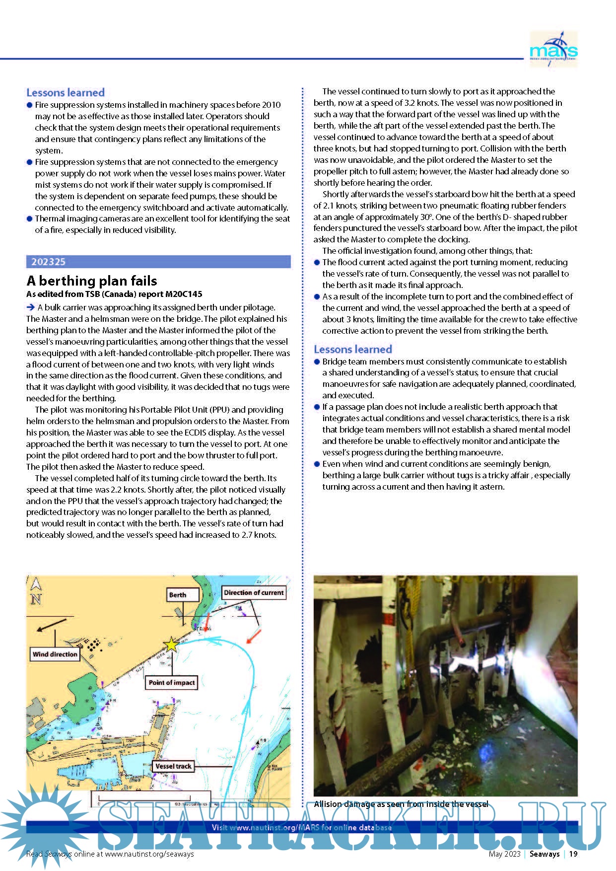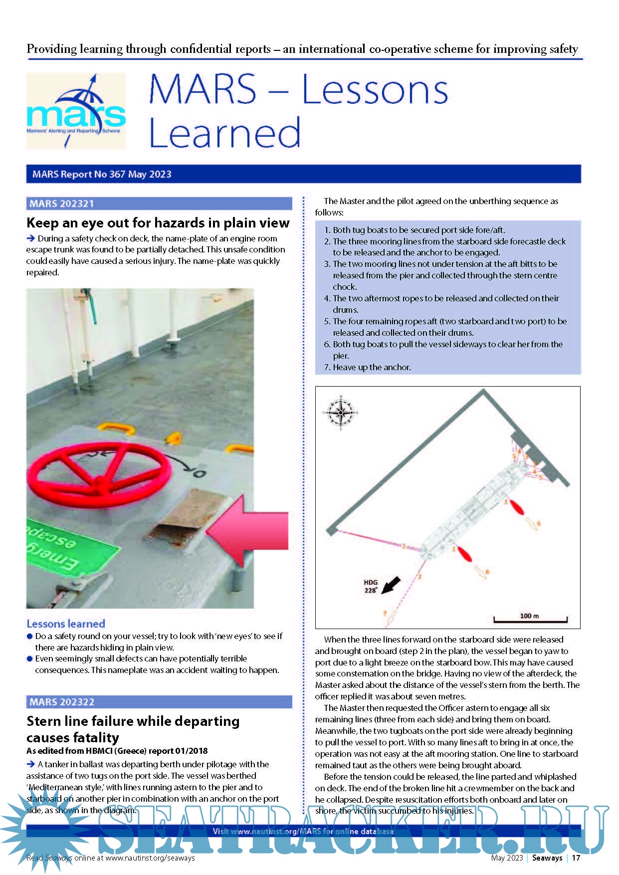 Year: 2023 Language: english Author: The Nautical Institute Genre: Periodical Format: PDF Quality: eBook Pages count: 4 Description: MARS Report No.367 May, 2023 Providing learning through confidential reports – an international co-operative scheme for improving safety.MARS is a searchable database containing reports of accidents and near misses stretching back over a quarter of a century. Funded through the generous support of the Institute's Nautical Affiliate partners, it is one of the maritime industry's leading risk reduction initiatives and is helping to make life safer for seafarers everywhere