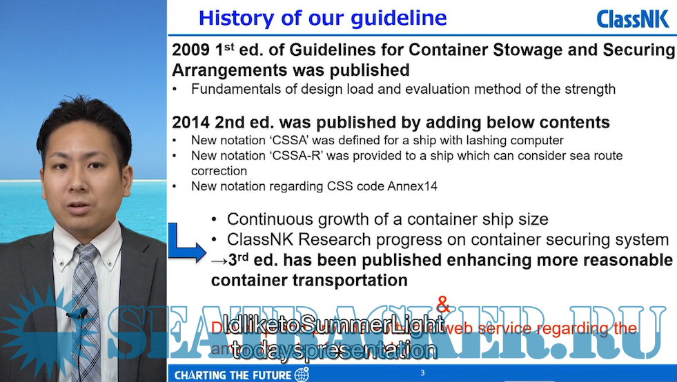 The guideline has been published for the growth of a container ship size andevolution of lashing technique, taking findings of Comprehensive Renewal of Part C and R&Dresults in ClassNK Research Institute into consideration.