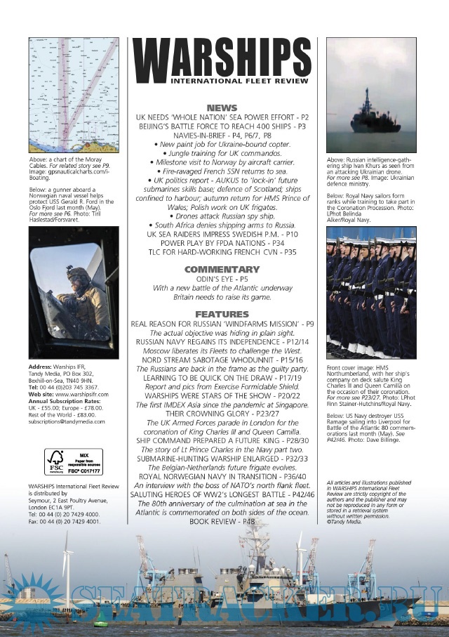 Description: Warships IFR puts the spotlight on the latest developments in the world’s navies. It covers current defence issues and has comments by leading analysts. The magazine regularly includes features on the Royal Navy and the US Navy in addition to incorporating news and features on all other navies across the globe. Warships IFR frequently carries in-depth articles on naval heritage.WARSHIPS International Fleet Review is published 12 times a year by Tandy Media Ltd who also publish Shipping Today & Yesterday (which provides news and features from the world of merchant shipping).