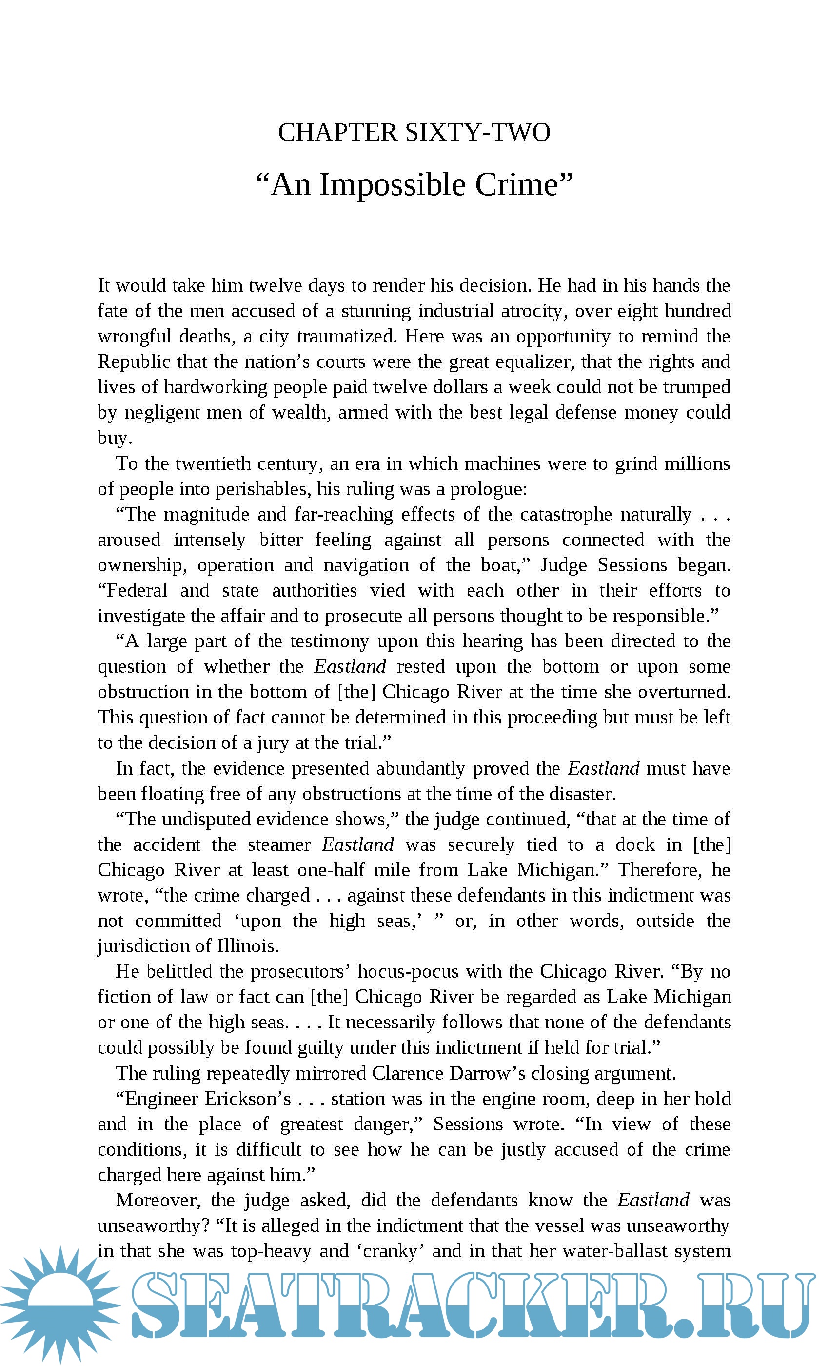 Year: 2014 Language: english Author: Michael McCarthy Genre: History Publisher: Lyons Press Edition: 1st ISBN: 9780762793280 Format: EPUB/PDF Quality: eBook Pages count: 320 Print length Description: It was the summer that broke America's heart. The untold story of the worst disaster on the Great Lakes in U.S. History. On July 24th, 1915, Chicago commuters were horrified as they watched the SS Eastland, a tourism boat taking passengers across Lake Michigan, flip over while tied to the dock and drown 835 passengers, including 21 entire families. Rockefeller, Morgan, and Carnegie had bought into the ship business in the Midwest, creating a boom market and a demand for ships that were bigger, longer, faster. The pressure-filled and greedy climate that resulted would be directly responsible for the Eastland disaster and others. As dramatic as the disaster was, the subsequent trial was even more so. The public demanded justice. When the immigrant engineer who was being scapegoated for the accident was left out to dry by the ship’s owners, penniless and down-on-his-luck Clarence Darrow decided to take his case. The defense he mounted, which he was too ashamed to even mention in his memoirs, would be even more shocking.