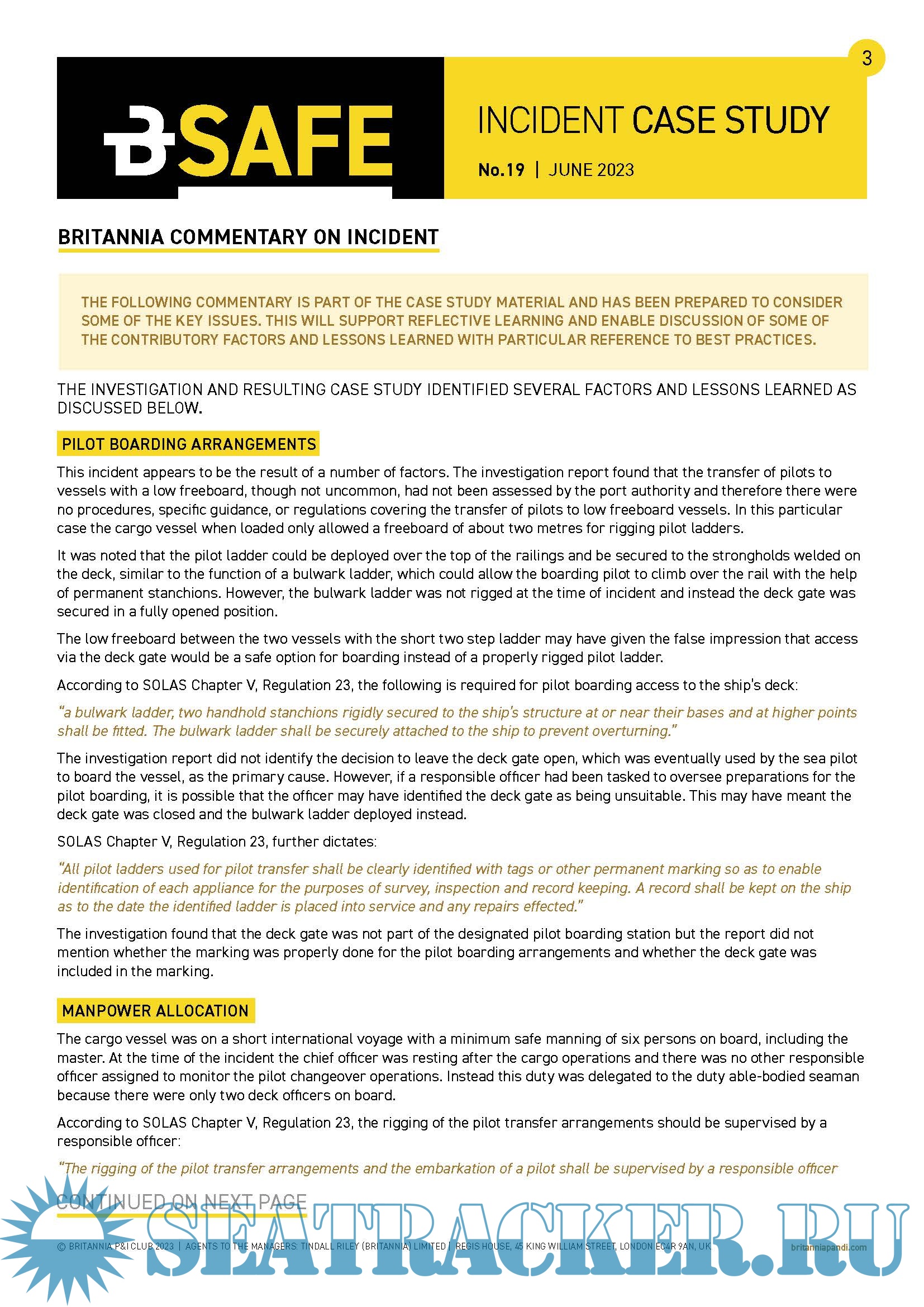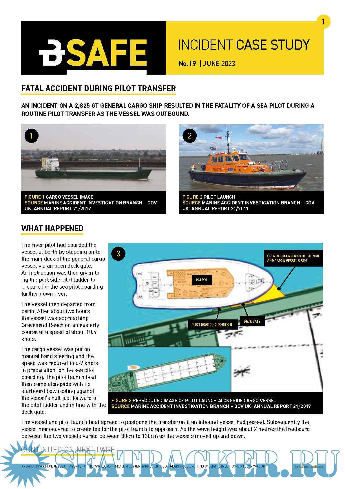 Year: 2023 Language: english Author: Britannia P&I Club Genre: Periodical (magazine) Format: PDF Quality: eBook Pages count: 8 Description: Fatal accident during pilot transfer an incident on a 2,825 gt general cargo ship resulted in the fatality of a sea pilot during a routine pilot transfer as the vessel was outbound. Using case studies as a way of analysing previous incidents and identifying lessons learned which can be shared with others, is an important part of improving safety performance. Encouraging reflective learning is a key element of BSafe. Each month issuing a new BSafe Incident Case Study. These will be based on a real accident or claim, appropriately anonymised, with a summary of the key lessons learned. Reflecting on past events is recognised as an effective way of learning from experience in order to positively influence future behaviours. This will include some suggestions for possible controls that could have helped mitigate the risk by using our interpretation of a Hierarchy of Risk Controls.
