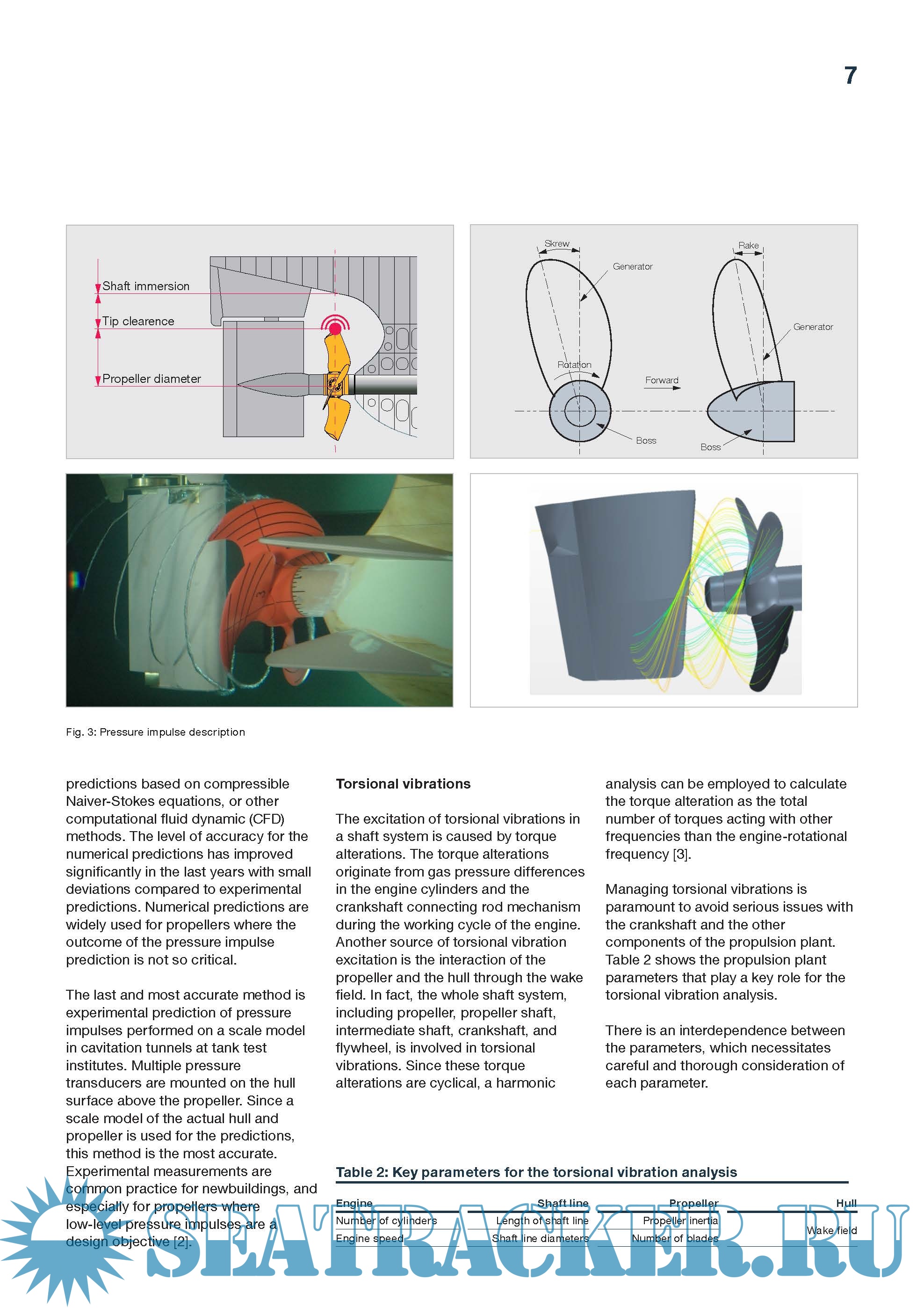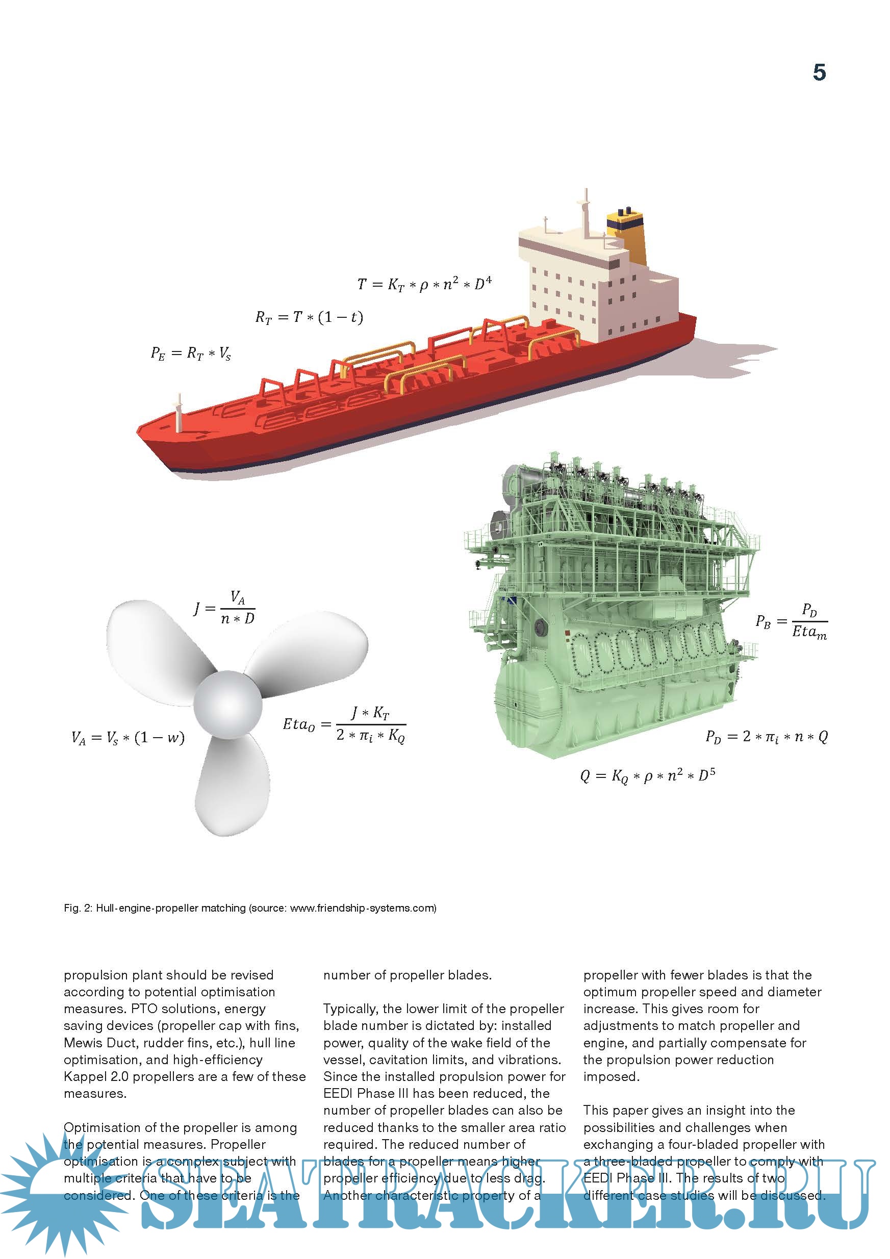 Description: The matching of hull, engine, and propeller has been challenged since the introduction of the EEDI phases, which calls for a propulsion power reduction. This paper explains how improved efficiency and reduced emissions can be achieved with three-bladed propellers, so that propulsion plants may comply with upcoming EEDI phases. The results of an investigation of torsional vibrations and surface hull pressure pulses are presented to provide a better overview of the interaction between hull and propeller. Two case studies, which include propeller optimisation studies, and analyses of torsional vibration and hull surface pressure pulses, are discussed to illustrate.