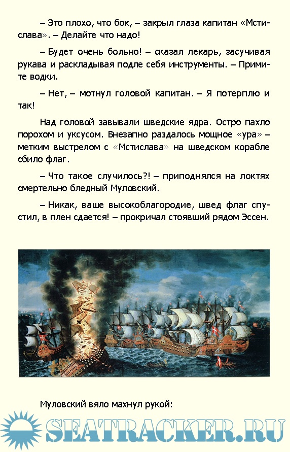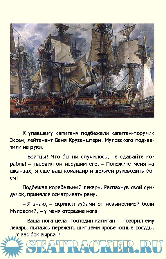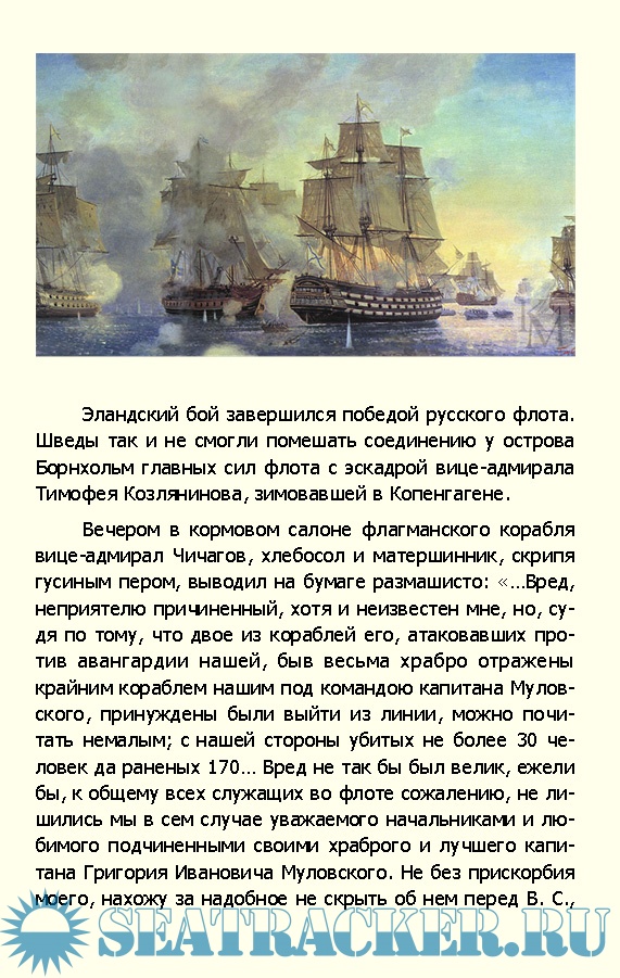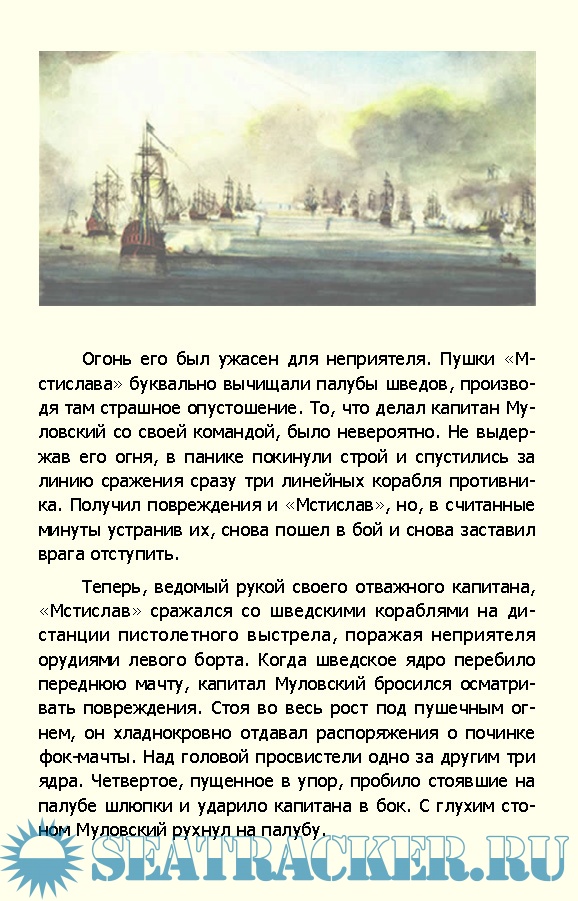 Описание: Григорий Иванович Муловский был лучшим морским офицером времен царствования Екатерины II. Его мечтой было совершить первое русского кругосветного плавания, но из-за войны со Швецией эти планы были отложены на неопределенное время. Муловский был назначен командиром корабля «Мстислав». На нём в 1788 году он участвовал в сражении при острове Гогланде. В этом сражении адмирал Грейг в своем донесении особо отметил мужество команды «Мстислава». Искалеченный ядрами шведских пушек, еле управляемый, «Мстислав» до конца не выходил из боя.