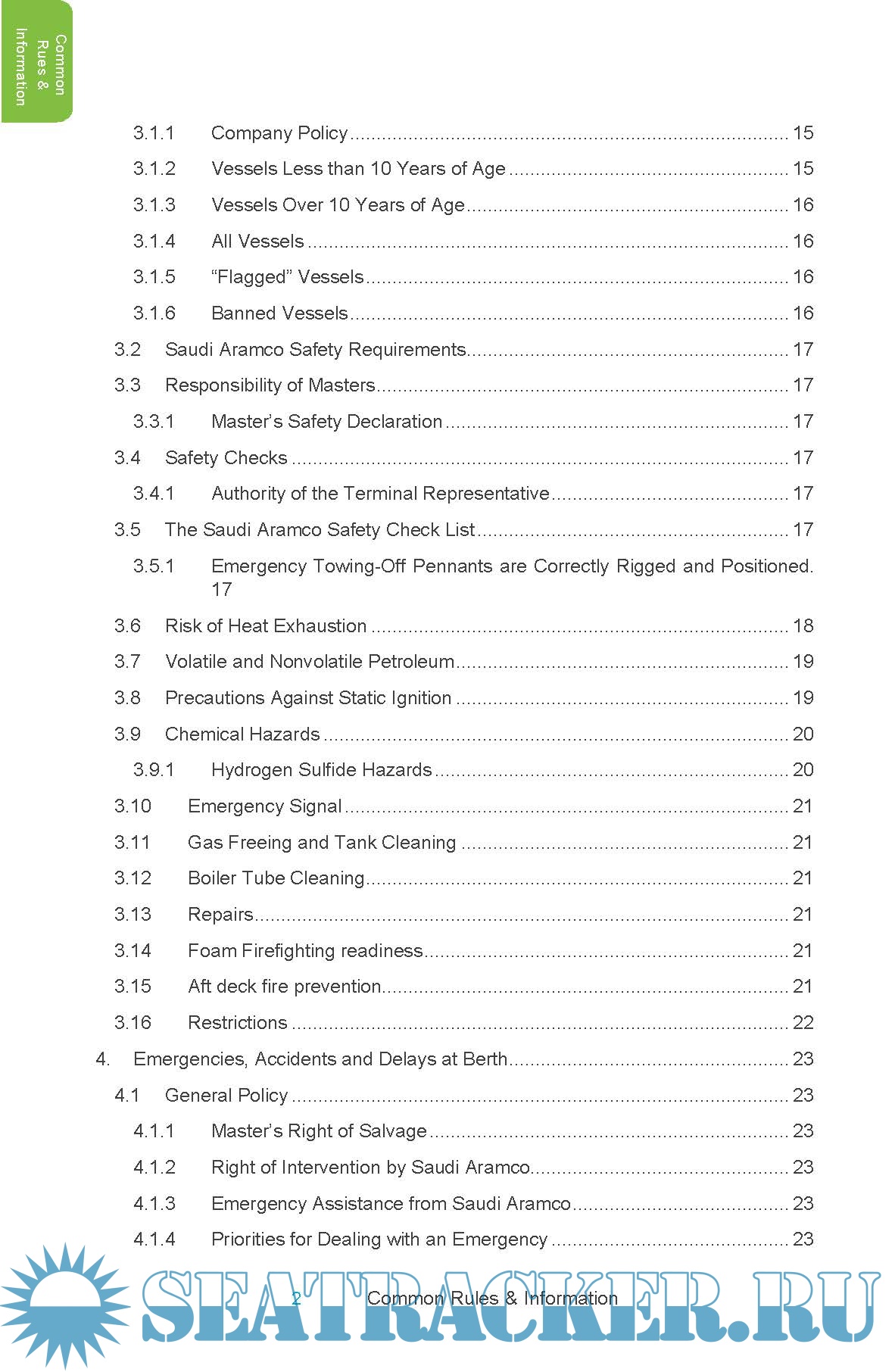 Description: This book is designed as a reference work for the purpose of acquainting Owners, Charterers, Masters of vessels and others with the general conditions, rules, regulations, facilities and available services at all Saudi Aramco Terminals. Every vessel which arrives at any Saudi Aramco Port or Terminal must have a copy of this book on board which is obtainable through the vessel’s agent. Every Master wishing to berth at any Saudi Aramco port or terminal must contract to comply with all the rules and regulations contained herein. This book does not replace or modify official publications covering the waters, areas, hazards or other subjects to which it pertains, nor is it intended for such purposes. The information contained herein is believed to be accurate at the time of going to press but Saudi Aramco makes no warranties and assumes no responsibilities regarding this book or any other information which may appear in supplemental publications, additions or corrections supplied by Saudi Aramco.