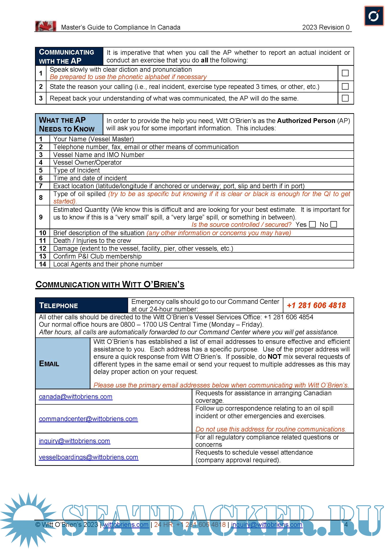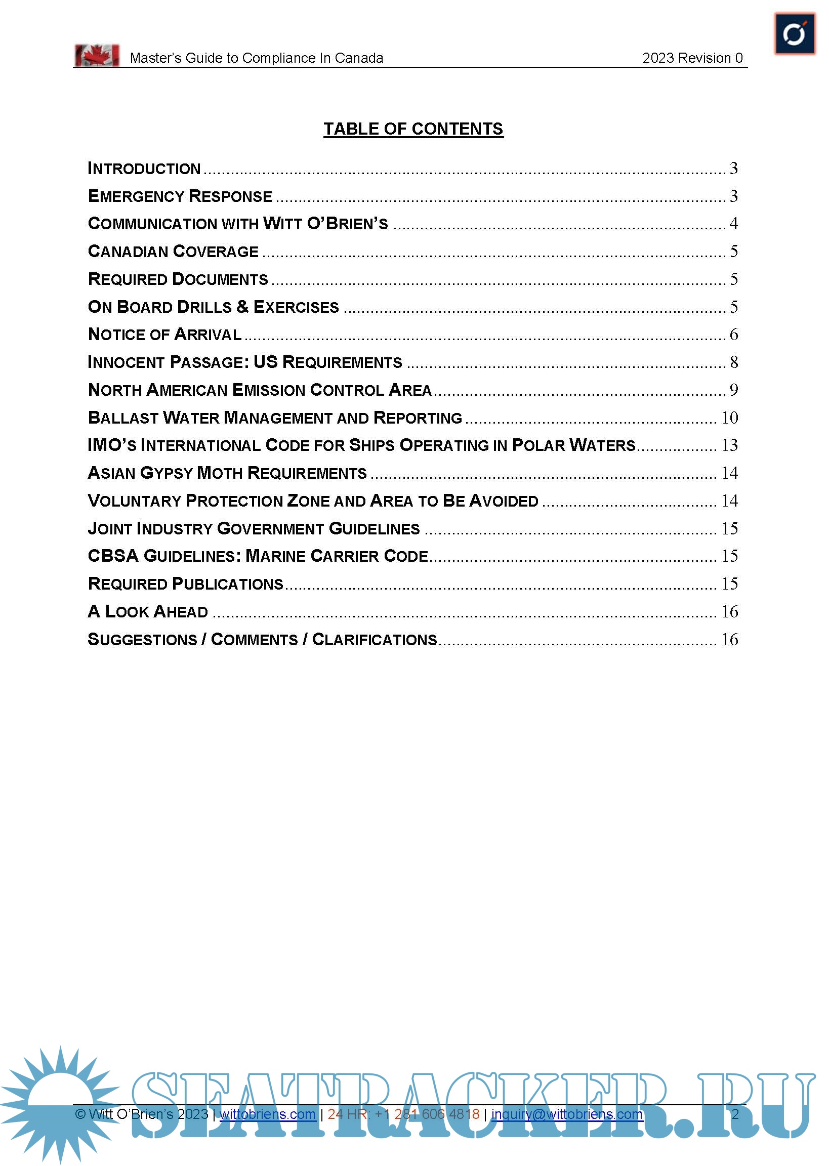 Year: 2023 Language: english Author: Witt O'Brien's Genre: Guide Edition: Revision 0 January 2023 Format: PDF Quality: eBook Pages count: 16 Description: The Master of any vessel making a call to Canada faces several regulatory issues that are specific toCanada. This guide is intended to help the Master effectively and efficiently face these issues. Witt O’Brien’s is providing this guide to help ensure your compliance. Use of the directions in the guide will allow Witt O’Brien’s to better serve you. Information designed to save you time and effort is present in orange italics. update for: https://seatracker.club/viewtopic.php?t=51552