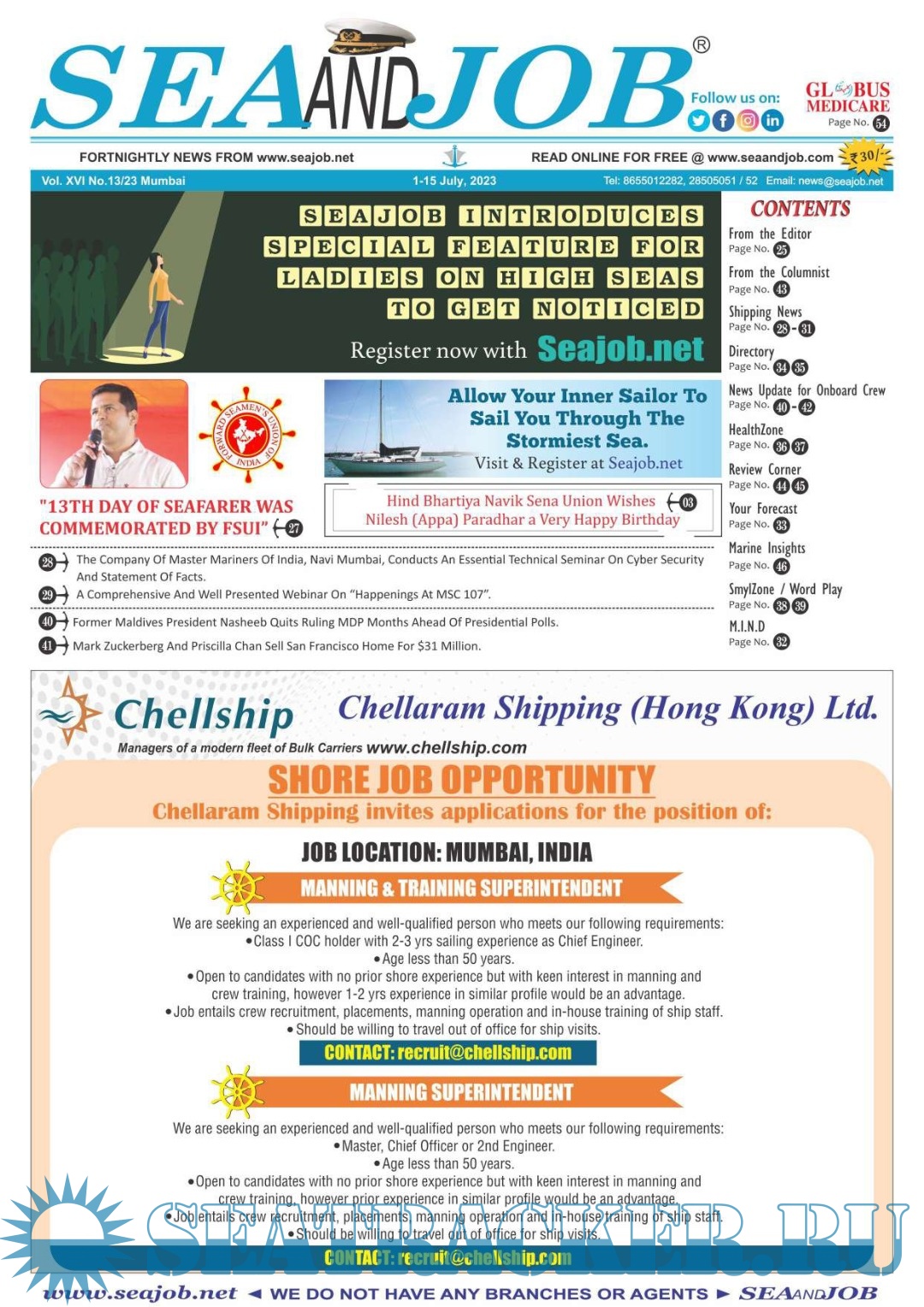 Description: The Sea and Job magazine launched in May 2007, was the second venture of Sea Line Group succeeding 'seajob.net' bringing the much renowned essence to the Group, the Sea and Job Magazine quickly gained popularity, becoming the No. 1 Shipping Magazine that came to be widely circulated all over India. Sea and Job over the years has evolved as the most trusted, ethical, objective and read maritime publication that possesses a large database of subscribers from various verticals in the industry.The magazine provides informative and interesting articles covering not just the shipping world but also the world outside it.Sea and Job is also a medium for the shipping/ manning companies to advertise marine jobs and also to promote their organization by publicizing internal activities like seminars, sports events and parties.Some notable endeavors of the magazine include the Know Your Recruiter Column, the Sailing Episodes Column and the Marine Insights section. The consistent efforts and the dedication to provide extraordinary services to the industry has resulted in the magnifying popularity and patronage of Sea and Job.