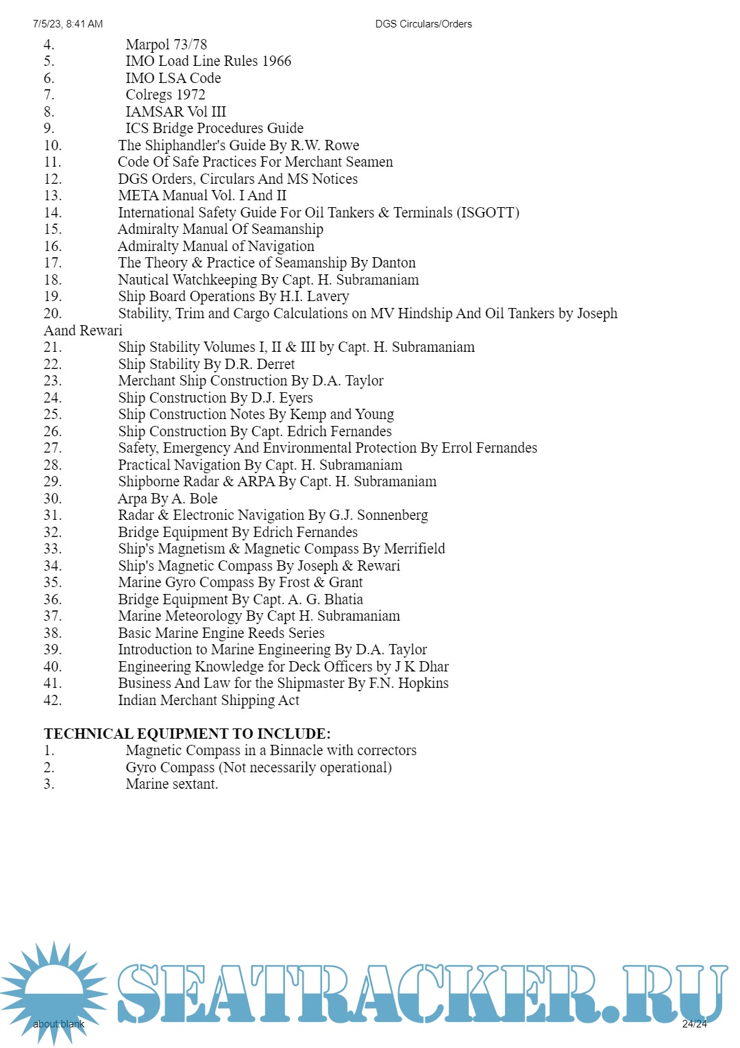 Year: 2004 Language: english Author: D.G. Shipping, India Format: PDF Quality: eBook Pages count: 24 Description: Syllabus for Officer In Charge of a Navigational Watch (Near Coastal Voyages) (NWKO NCV) Course Mercantile Marine Department (MMD), India Examinations. Objectives: The objective of this course is to prepare a candidate to appear for the examinations ofCertificate of Competency as NWKO (NCV). Aims: This course covers part of the education and training required under Regulation II/1 (NCV) andaims to meet the standards of competence specified in Section A-II /1 (NCV) of the STCW 95. Appendix M-II/5C of META Manual Vol. II should be used in the preparation of material for this course.