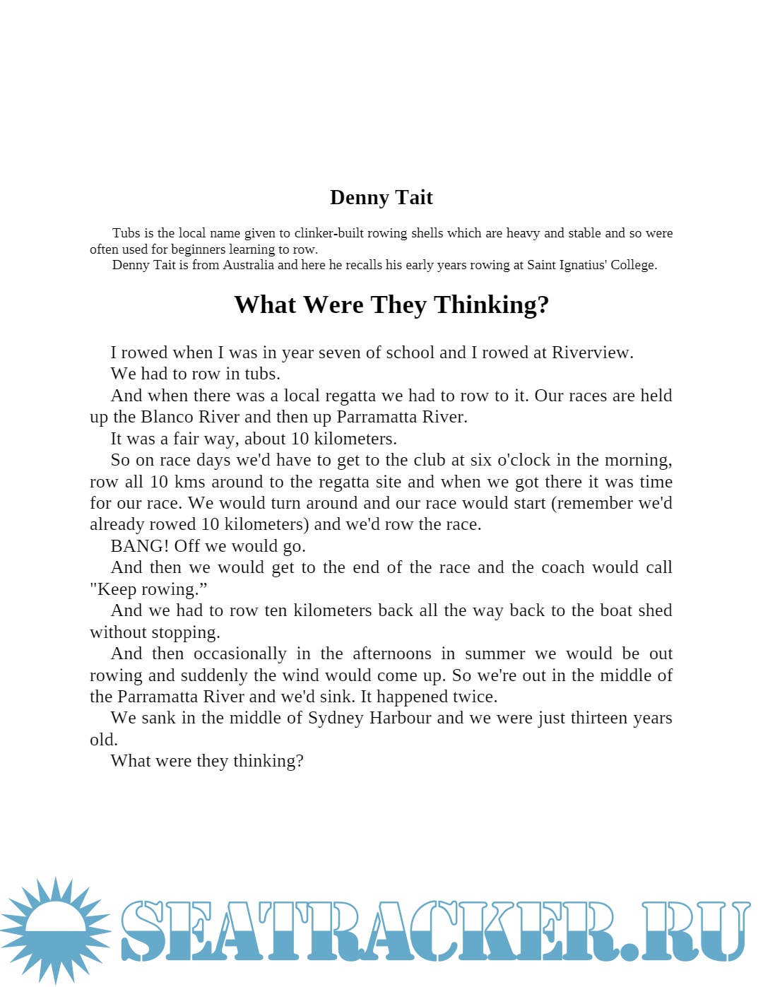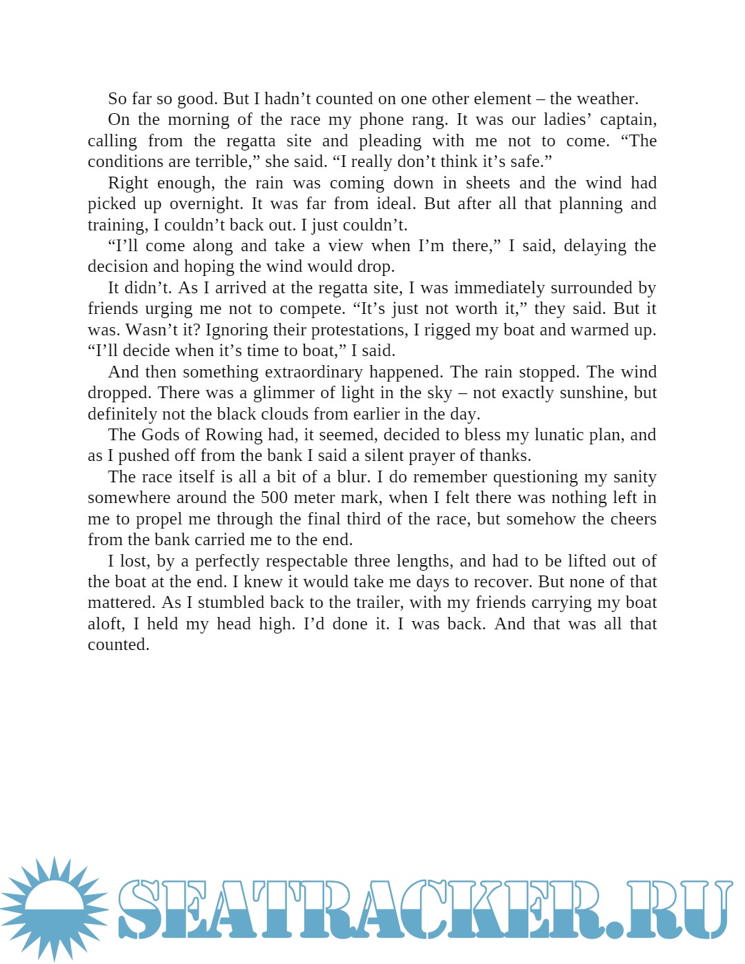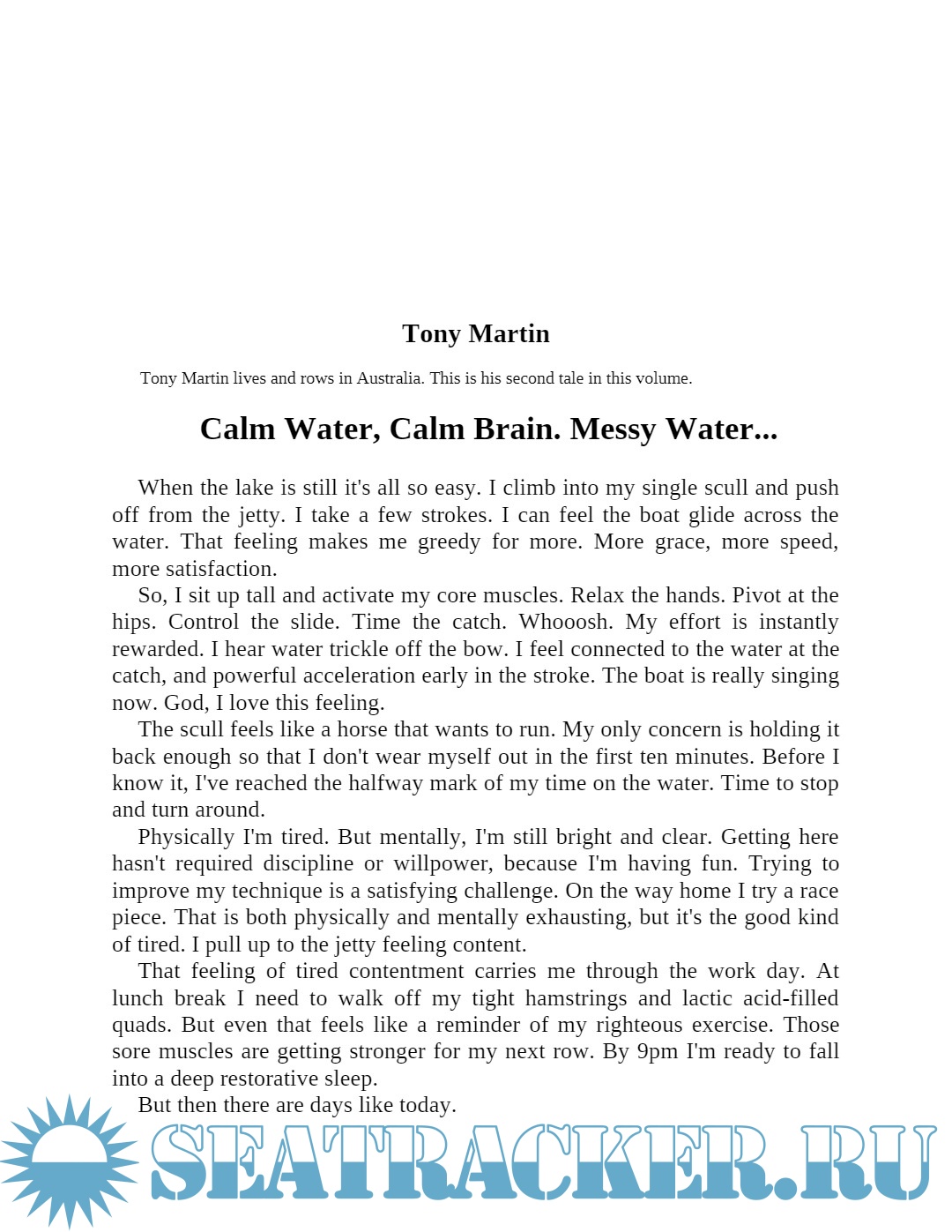 Year: 2020 Language: english Author: Rebecca Caroe Format: PDF Quality: eBook Pages count: 151 Description: Rowing Tales 2020 covers the strange year we've all lived through. Our tales explain our situation - and give us hope that we will continue to row again in the future.Most of these tales are NOT about Covid19, they're a blend of quick-fire anecdotes, misdemeanours and some quiet triumphs. I have included several ocean and coastal rowing stories - more of us row coastal every year and you'll see the appeal when you read Guin Batten and Ben Booth.For the first time I've included some group stories on common themes - umpiring situations, coaching situations you wish hadn't happened, and daft things we've done. I guarantee a wry smile and laugh out loud hilarity Additional info: https://seatracker.club/viewtopic.php?t=56421 https://seatracker.club/viewtop...hp?p=94239#94239