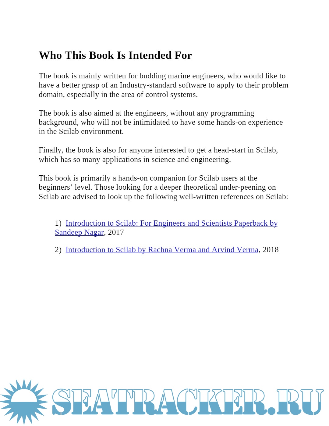 The Scilab Basics is mainly written for budding marine engineers, who would like to have a better grasp of an Industry-standard software to apply to their problem domain, especially in the area of control systems.