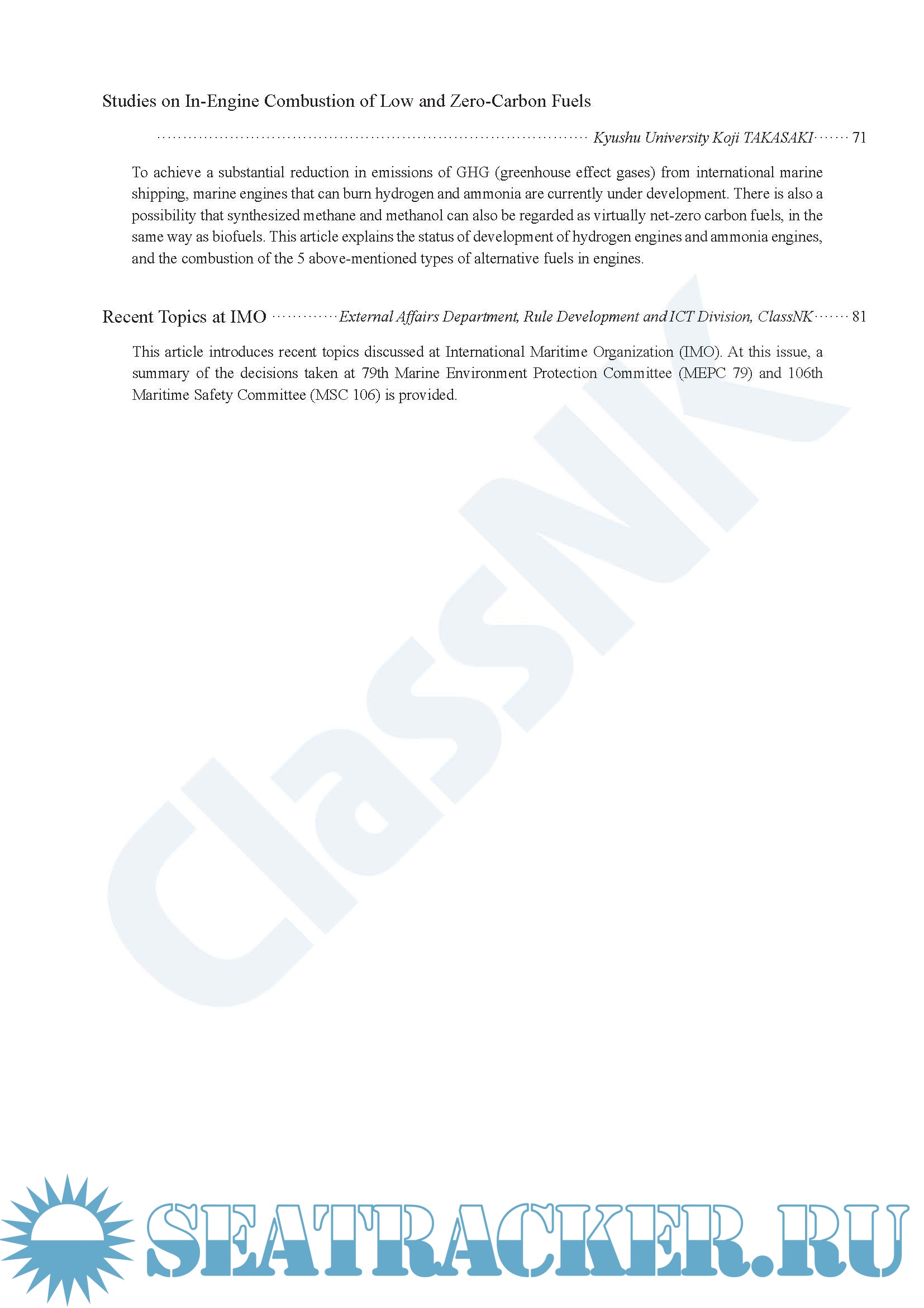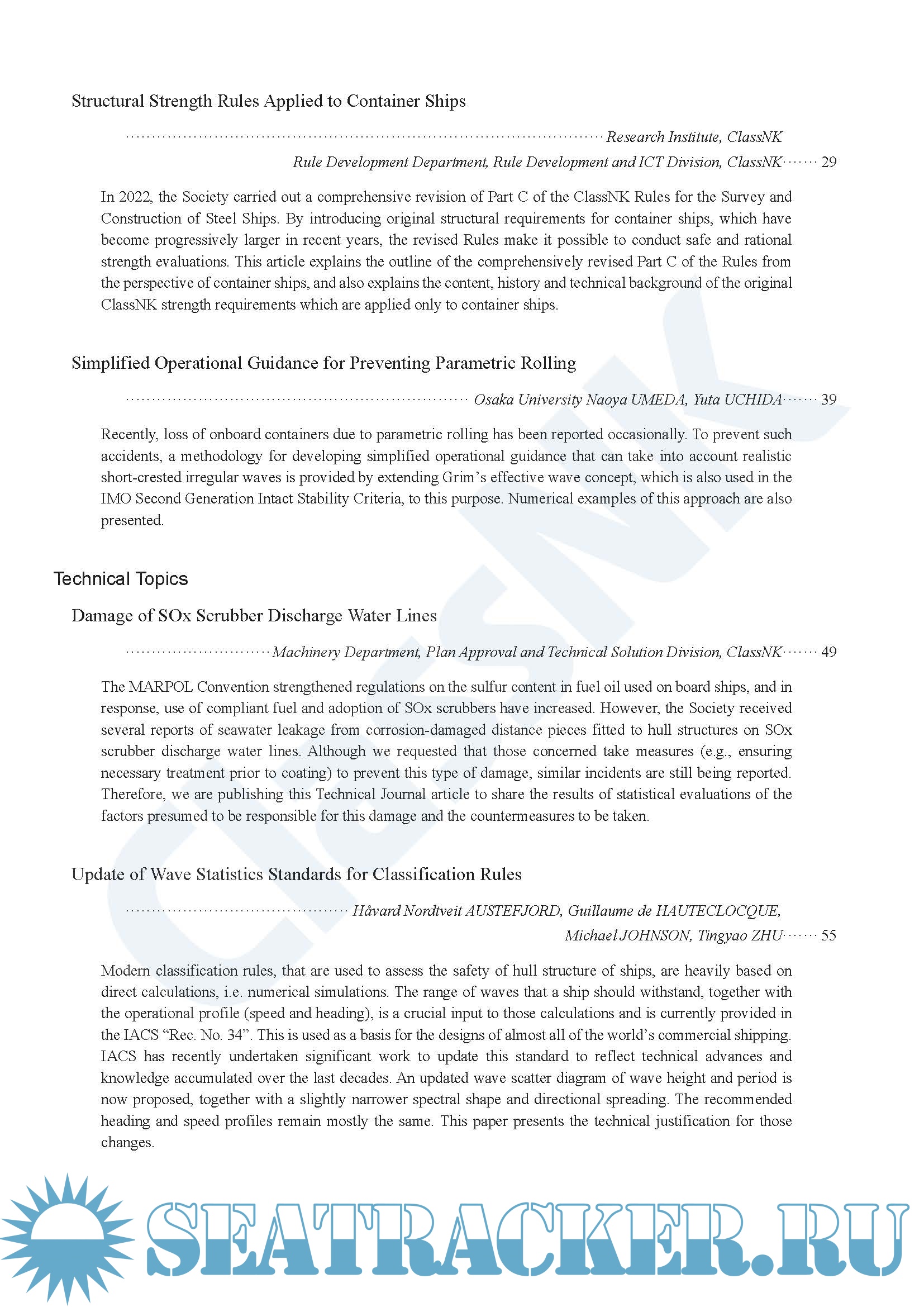 Year: 2023 Language: english Author: ClassNK Genre: Periodical (magazine) Format: PDF Quality: eBook Pages count: 75 Description: Special Feature of ClassNK Technical Journal No. 7 on “Activities for Safe Operation of Container Ships" issue July, 2023. ClassNK Technical Journal introduces articles written by person in charge of research and development in this organization and joint research project with the shipbuilding and marine industries. Not only maritime related themes, but also a wide range of advanced technologies related to the environment and safety are posted. The purpose of this magazine is to contribute to technological progress and social development by widely disclosure of these activities. For ClassNK Technical Journal No. 7, have assembled a Special Feature entitled “ Activities for Safe Operation of Container Ships,” which presents an overview of the structural rules and above-mentioned Guidelines for container ships. This issue also includes a diverse range of other articles and papers on various research and development achievements, the technical activities of Class NK, trends in the International Maritime Organization (IMO) and other relevant topics.