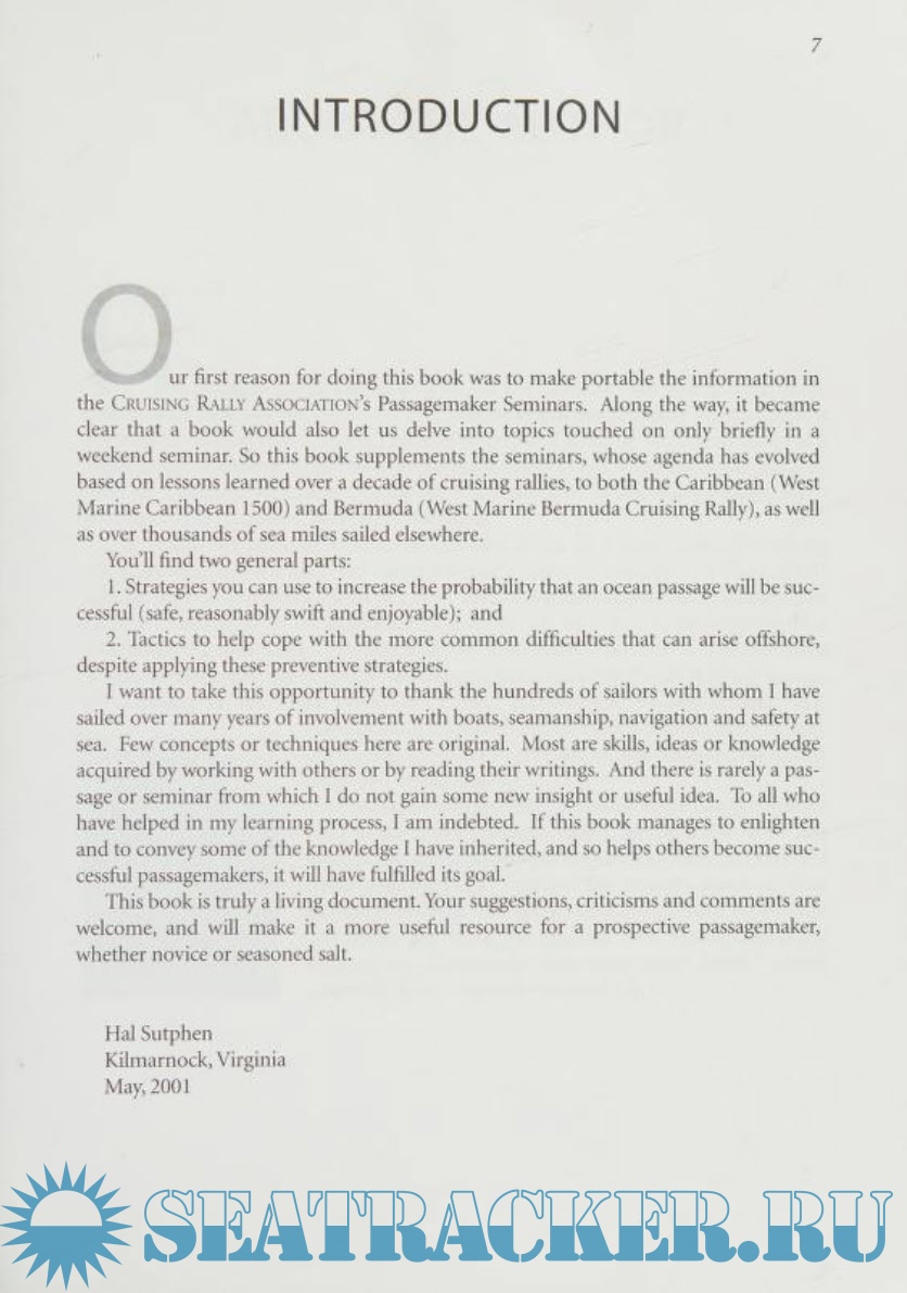 Year: 2001 Language: English Author: Hal Sutphen Genre: Handbook Publisher: Cruising Rally Association Edition: First ISBN: 978-0970456007 Format: PDF Quality: Scanned pages Pages count: 320 Description: A ocean cruising handbook, Advanced Bluewater Cruising provides a comprehensive guide for coastal cruising sailors wishing to make the step up to ocean cruising. In an easy-to-use format, Advanced Bluewater Cruising first outlines key differences between coastal and offshore cruising, offers some sound criteria for selecting a boat, and presents the pros and cons of major equipment options. Following chapters include such practical topics as voyage planning, fear as a guide to action, the skipper as leader, crew responsibilities and routines, watchstanding, managing personal affairs (mail, money, bills, emergency contacts), provisioning, stowage and cooking, medical preparedness and more. The weather and up-to-the-minute communications sections will help in interpreting weather systems and in using today's onboard communications tools to get the best forecast information. Sail selection, care and trim chapters will prove useful both before and during ocean passages. The first two-thirds of the book set forth practical steps to successful passagemaking under sail. The remaining third presents methods of coping with adversity in various forms: heavy weather, illness and injury, dismasting, fire, flooding, with specific sections on troubleshooting your engine, your steering and your electrical system. Illustrated, and with radio frequency lists, watchstanding schedule options, medical prescription information and more. Additional info: The book is intended primarily for newer bluewater cruising sailors. It will prove useful as well for more experienced offshore cruising sailors. It is a great presentation of all the fundamentals that every sailor should know before heading out on an offshore passage. And there is much up-to-the-minute information on this ever-changing subject.
