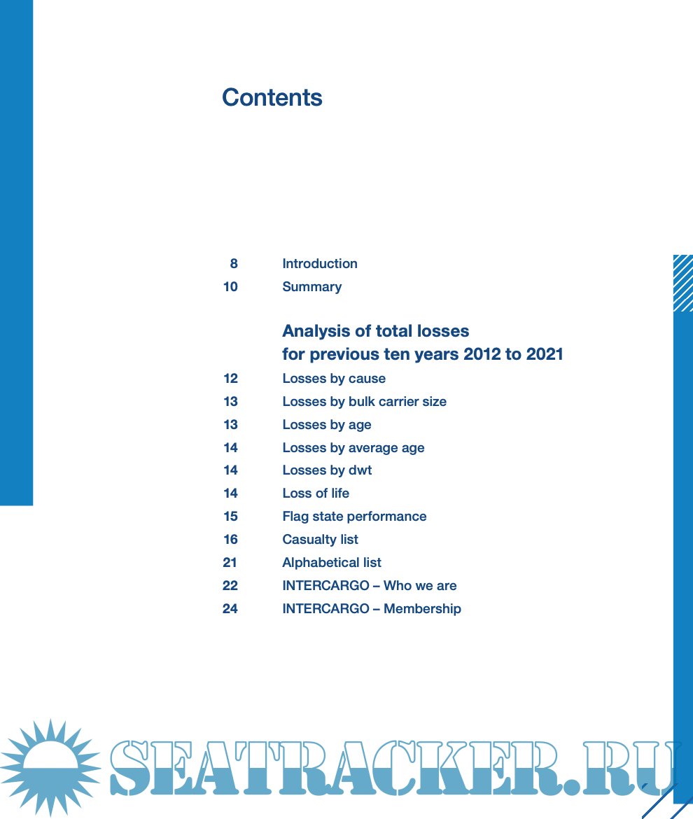 Year: 2022 Language: english Author: Intercargo Genre: Other Publisher: Intercargo Format: PDF Quality: eBook Pages count: 28 Description: Between the years 2012 to 2021, 27 bulk carriers over 10,000 dwt have been identified as total losses and 92 crew members have lost their lives. The average age of bulk carriers lost was 19.6 years and in total 2.3 million dwt have been lost which equates to an average 230,000 dwt per year. Cargo liquefaction remains the greatest contributor to loss of life and grounding remains the greatest cause of ship losses. Additional info: Previous report here in the tracker: https://seatracker.club/viewtopic.php?t=40312