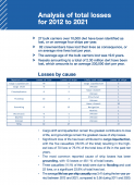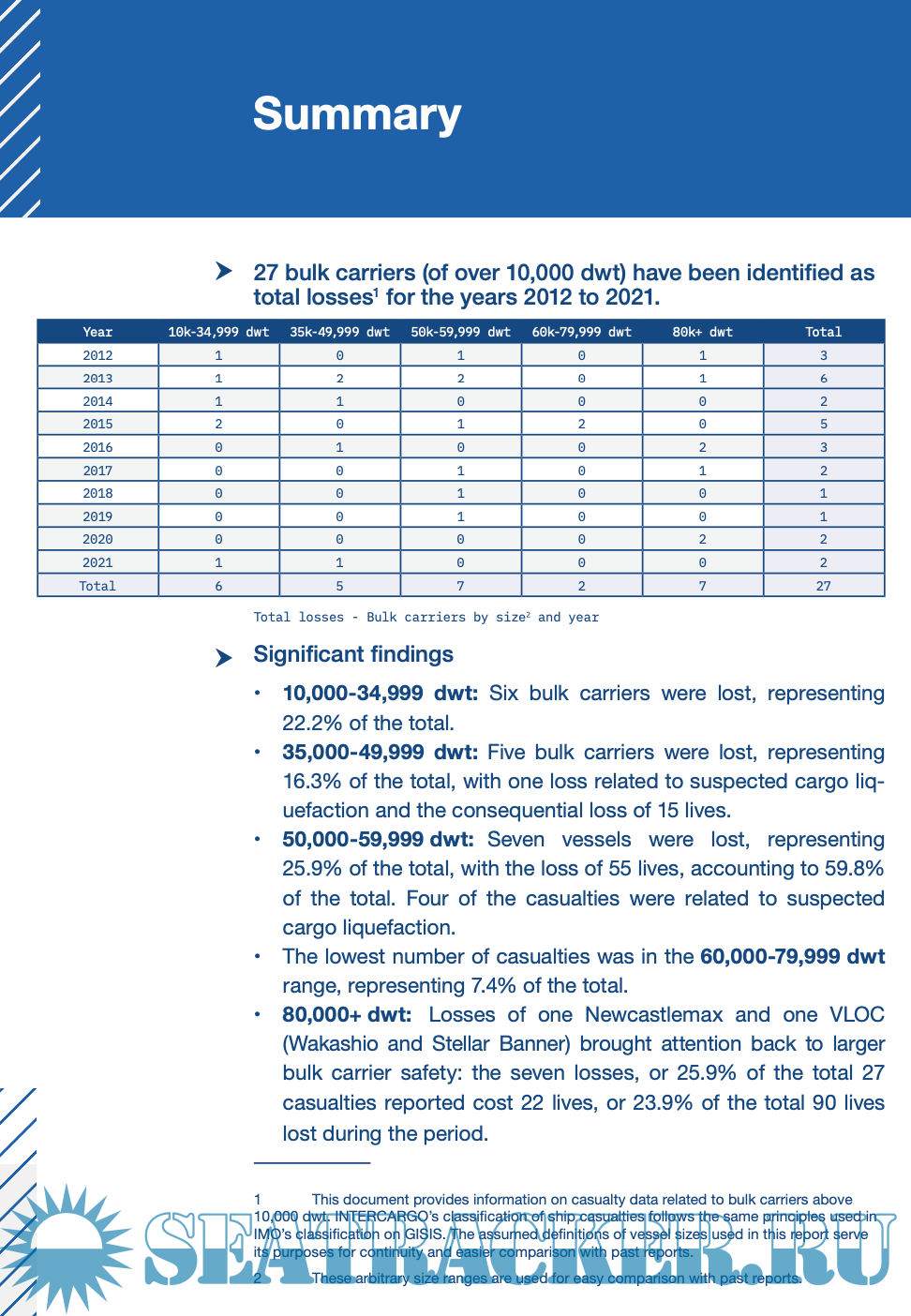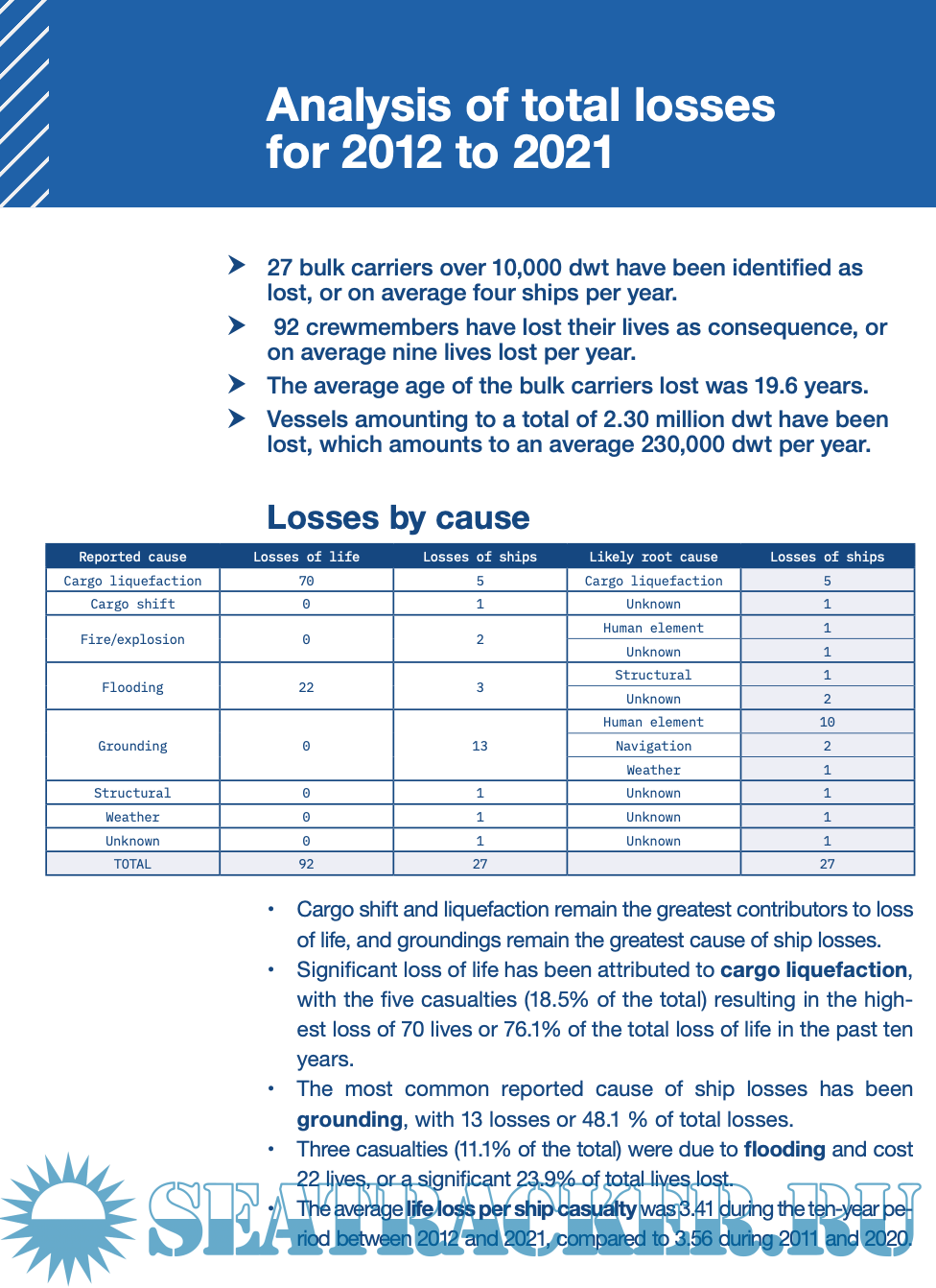 Description: Between the years 2012 to 2021, 27 bulk carriers over 10,000 dwt have been identified as total losses and 92 crew members have lost their lives. The average age of bulk carriers lost was 19.6 years and in total 2.3 million dwt have been lost which equates to an average 230,000 dwt per year. Cargo liquefaction remains the greatest contributor to loss of life and grounding remains the greatest cause of ship losses.