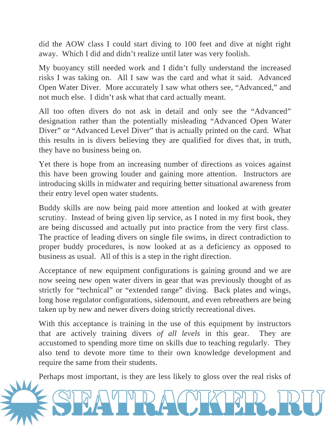 Year: 2016 Language: english Author: James Lapenta Genre: Guide Edition: Kindle | 1st Format: PDF Quality: eBook Pages count: 330 Description: Building on his first book, "SCUBA: A Practical Guide for the New Diver", James Lapenta addresses what is most often the next step in diver training. Advanced Level or Advanced Open Water training is often taken by divers to gain additional skills and knowledge. It is also taken to allow them to gain access to more challenging dives and dive sites. These also pose a greater degree of risk to the individual. Unfortunately some advanced classes are no more than a "taste" or "tour" of advanced level dives. The divers do not get the new knowledge and skills required to safely embark on these dives. In order to safely pursue these dives James has outlined the steps to take to reduce the risk of injury and worse. From describing the dives to offering advice on the content one should expect, as well as selecting an instructor, he offers new and not so new divers guidance. Additional sections on equipment options, air supply management, dive planning, and dive selection for maximum learning potential are looked at. Also included is a section on a subject often overlooked in recreational SCUBA diving - the after-effects of a diving accident and rescue/recovery on the rescuer and witnesses to the event. Post Traumatic Stress in Recreational Dive Rescues is a real possibility and one that must be looked at when executing dives with greater risk. Safety in training and after training is the heart of this work and the driving force behind its publication. James has experienced the best in training and that which left something to be desired. He gives examples of both throughout the work. If you do not have his first book, it is highly recommended that you also acquire it as a companion to this one. While they do contain some sections of the same information, there are sections in the first book that are not included in this that are highly beneficial. Additional info: https://seatracker.club/viewtopic.php?t=57275 About the Author:James Lapenta was first certified as an Open Water Diver in 2004. He has numerous specialties from several agencies and earned his Instructor certification with the YMCA Scuba program in 2008. This subsequently became Scuba Educators International and he made the transition to it in October of 2008 and formed UDM Aquatic Services to offer instruction, and since 2011, equipment. He received his CMAS 2 Star Instructor Rating in August of 2010. Jim has logged dives in conditions ranging from warm, clear water in the Florida Keys, Bonaire and Puerto Rico, and Technical Dives to the cold depths of Lake Erie and the St. Lawrence River. A fan and proponent of local diving, he has explored numerous lakes and quarries in West Virginia, Ohio, and Pennsylvania. As of 2013, he has certified or assisted in the certification of over 170 students from Junior Open Water to Dive Master. He specializes in working with younger people and others needing extra attention for any reason. Jim has authored a course in Underwater Navigation for SEI Diving, and has developed a new Advanced Open Water course that has drawn students from hundreds of miles away. He is also a co-author and editor of a course in Search and Recovery and entry level Public Safety Diving. In 2011 his book SCUBA: A Practical Guide for the New Diver was officially released. It now has readers in 20 countries on six continents. Making him an internationally known author in the Scuba Diving community. Most recently in 2012 he added to his instructor ratings by doing a crossover to SDI/TDI (Scuba Diving International/Technical Diving International) to offer classes and specialties in Deep, Wreck, Night/Limited Visibility, Computer Nitrox, and TDI Nitrox and TDI Intro to Tech classes. He is also a fully authorized HOG Equipment Service Clinic Instructor.