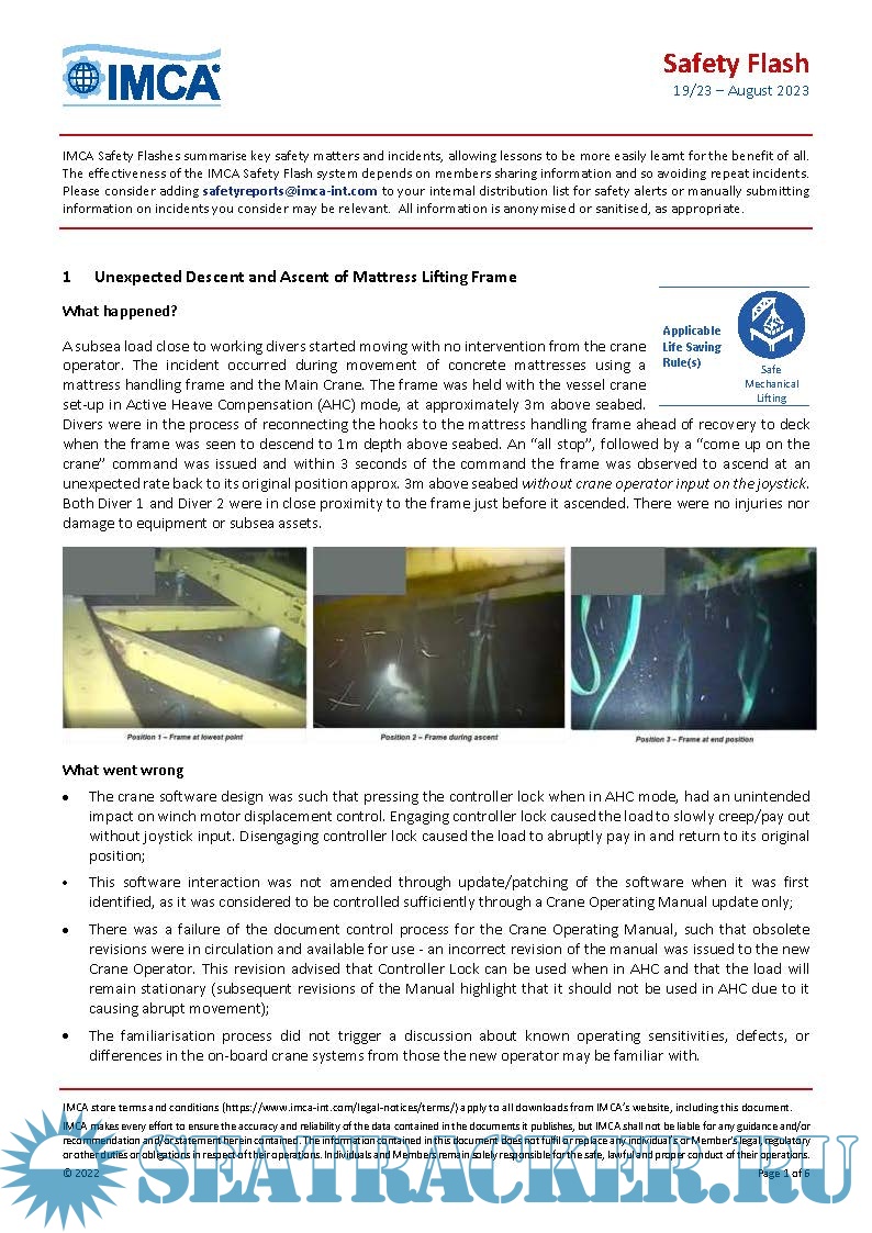 Description: The International Marine Contractors Association ( IMCA ) Safety Flashes disseminate important information on incidents and potential hazards and the lessons learnt from them that can help prevent incidents occurring elsewhere in the industry.IMCA Safety Flashes and systems for incident reporting and analysis are an important tool for sharing vital information.By publishing them, IMCA helps its members around the world identify potential hazards, share lessons learned and avoid repetition.Safety Flashes should be succinct, specific, factually correct and written in clear language.The Secretariat will assist with this through formatting and checking of the material submitted.