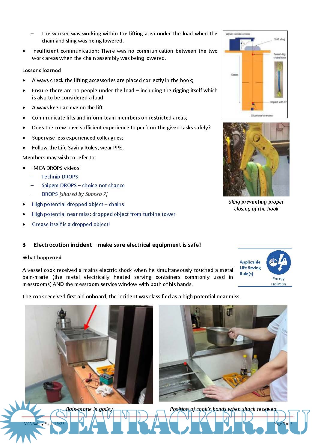 IMCA SF 19/23 - Unexpected Descent and Ascent of Mattress Lifting Frame - High potential: dropped chain assembly - Near miss with high pressure gas due to incorrect procedures - Electrocution incident – make sure electrical equipment is safe! - MSF: person injured falling between decks