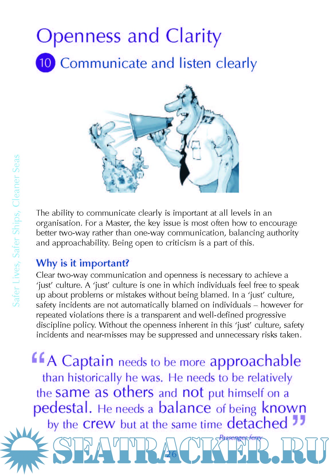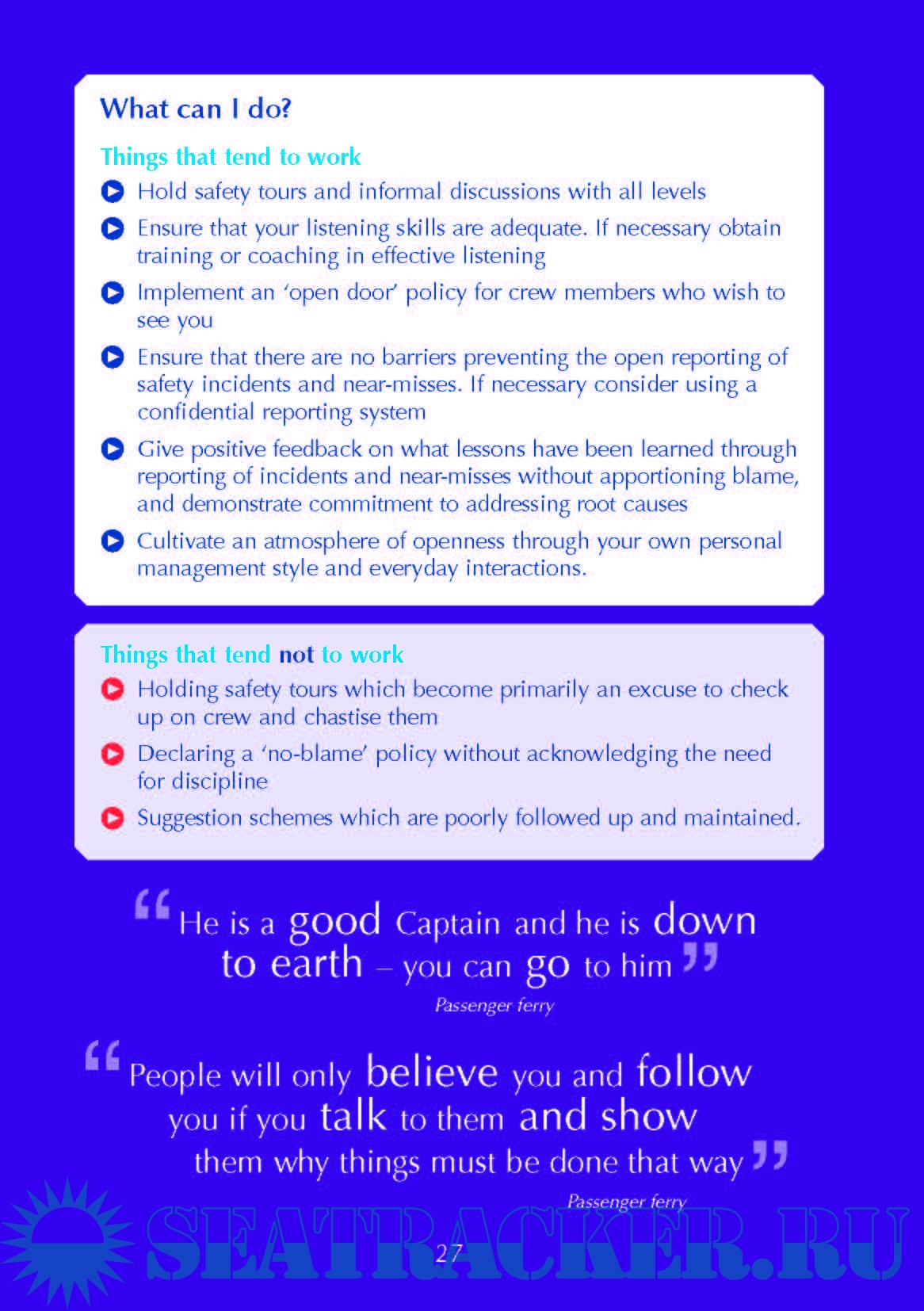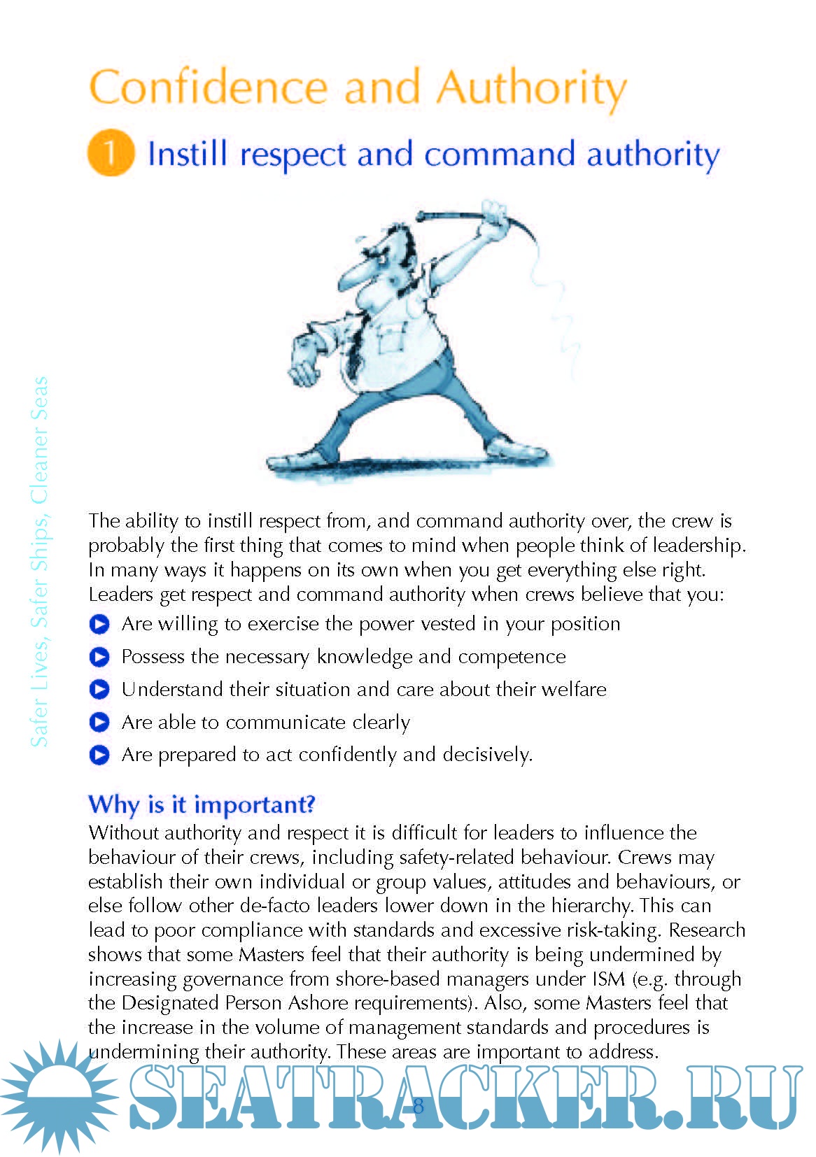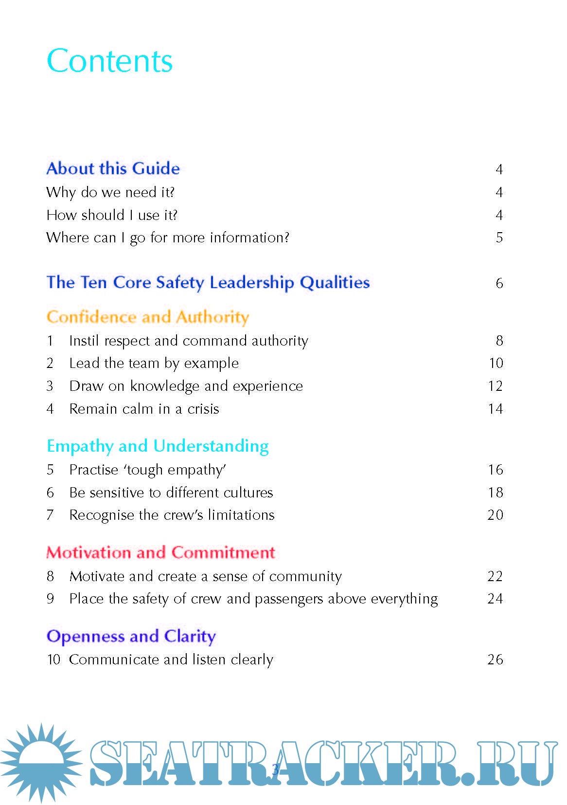 Year: 201x Language: english Author: Maritime and Coastguard Agency (MCA) Genre: Guide Format: PDF Quality: OCR without errors Pages count: 28 Description: This guide from the Maritime and Coastguard Agency (MCA) aims to help leaders and senior officers in the maritime industry improve their leadership and people management skills in order to ensure safe operations. It contains tips and best practices for 10 core leadership qualities for effective safety leadership, split into 4 categories. This guide is based not just on theory but also on real life, including consultation with over 65 seafarers and shore managers about everyday safety leadership challenges. You will see that some of it is common sense, but nearly everyone can benefit from a reminder. What matters, however, is how leaders behave in everyday situations. Your crews will draw inferences about your safety leadership based on what they see you do and what they hear you say, far more than what you might declare in a speech or a written communication. Additional info: