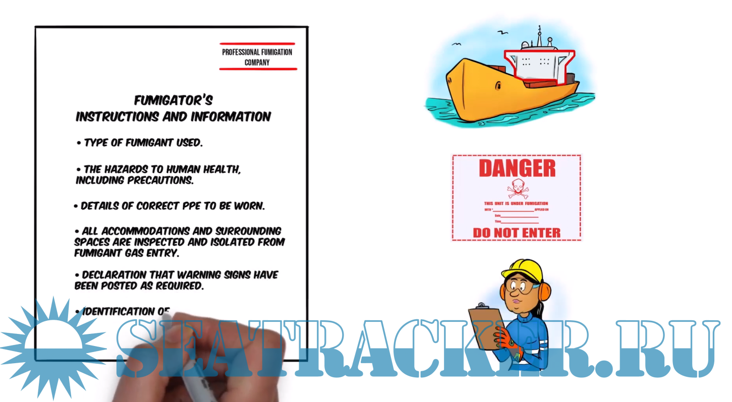After applying the fumigant, the fumigator remains on board to ensure no gas leaks occur from cargo holds. Then, before departing, they confirm that the ship is safe and give the Master a written statement. Finally, before sailing, the Master must ensure all precautions are in place.