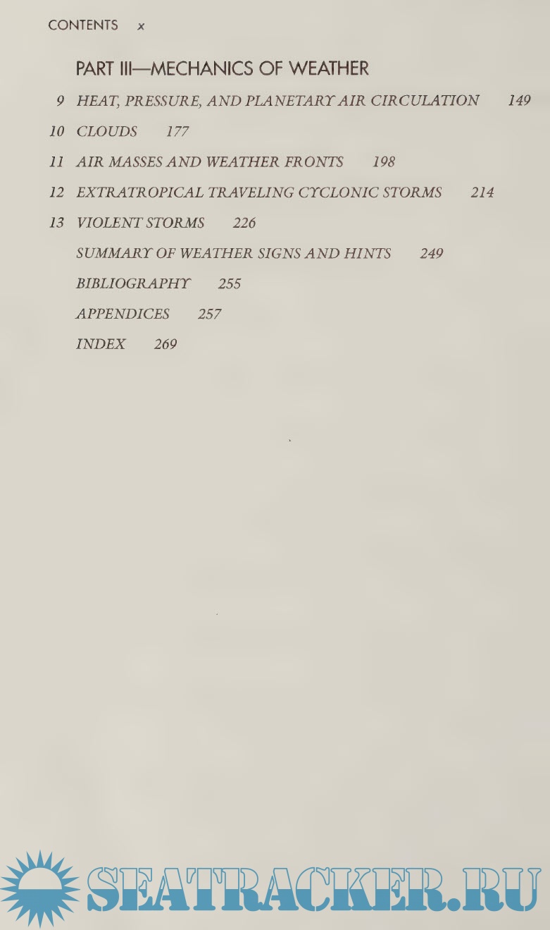Contents include: sources and distribution of weather information; public access to weather reports; onboard instruments; weather in the major areas of North America; fog; weather and the oceans; freshwater lakes and rivers; heat, pressure, and planetary circulation; El Ni–o and La Ni–a; clouds; air masses and weather fronts; cyclonic and violent storms; and more.