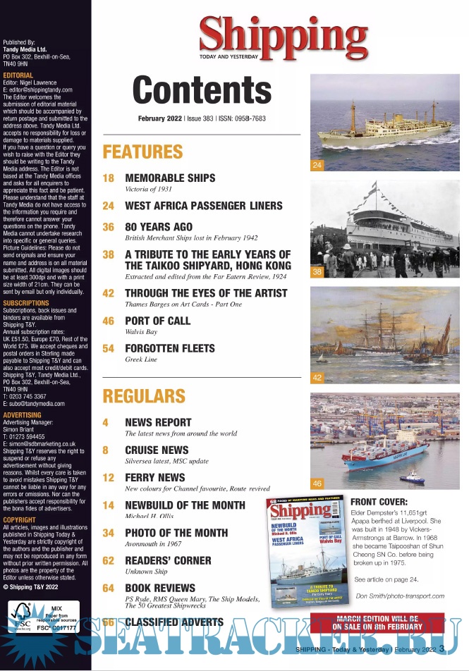 Description: Warships IFR puts the spotlight on the latest developments in the world’s navies. It covers current defence issues and has comments by leading analysts. The magazine regularly includes features on the Royal Navy and the US Navy in addition to incorporating news and features on all other navies across the globe. Warships IFR frequently carries in-depth articles on naval heritage.WARSHIPS International Fleet Review is published 12 times a year by Tandy Media Ltd who also publish Shipping Today & Yesterday (which provides news and features from the world of merchant shipping).
