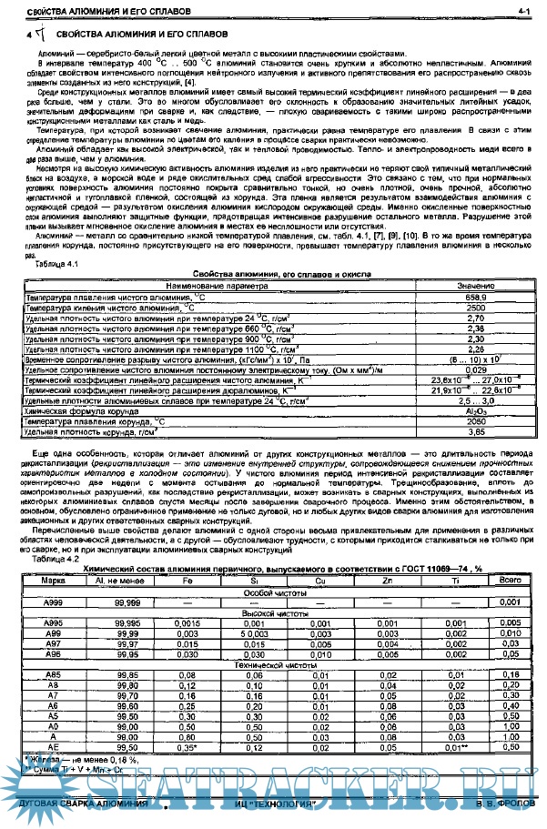 Год выпуска: 2003 Язык: русский Автор: В.В. Фролов Жанр: Учебное пособие Формат: PDF Качество: Отсканированные страницы Количество страниц: 65 Описание: В пособии "Дуговая сварка алюминия" в простой, доступной и лаконичной форме представлены: физические и химические, технологические и эксплуатационные свойства алюминия; особенности его дуговой обработки (сварки и наплавки): оборудование, техника, технология дуговой обработки алюминия и его сплавов; характеристики основных и вспомогательных материалов; конструктивные элементы сварных швов и наплавочных валиков. В соответствующих разделах представлена информация по правильному их выбору и применению. Отдельный раздел посвящен очень актуальной проблеме – сварке алюминия со сталью. Описание принципов работы сварочного оборудования выполнено на примерах лучших мировых образцов оборудования для сварки алюминия, выпускаемого ведущими отечественными и зарубежными предприятиями. Книга рассчитана на широкий круг читателей. Настоящее пособие может представлять интерес как для рядовых сварщиков, занимающихся изготовлением или ремонтно-восстановительными работами алюминиевых и алюминиево-стальных конструкций, руководителей ремонтных служб, так и для проектировщиков вновь создаваемых конструкций из алюминия (конструкторов, технологов и их руководителей), бизнесменов. Пособие может быть рекомендовано для учащихся, студентов и преподавателей различных учебных заведений в качестве учебника при изучении применяемости алюминиевых сварных швов, особенностей дуговых сварочных технологий и эксплуатации оборудования при дуговой обработке алюминия.