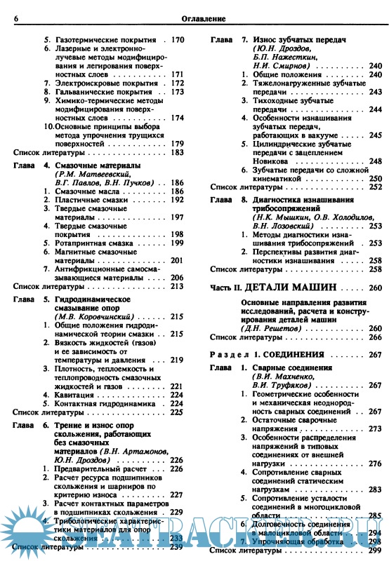 Изложены трение, износ и смазка: сила трения, интенсивность изнашивания, гидродинамическая и контактно-гидродинамическая теории смазки, материалы трущихся поверхностей, их упрочнение и покрытия, смазочные материалы. Приведены направления развития теории, расчета и конструирования деталей и узлов машин общемашиностроительного применения всех основных видов: соединений, передач, валов и осей, подшипников, упругих элементов, муфт, точность, кинематика, материалы и упрочнения, виды отказов, динамика, расчеты на прочность, вероятность безотказной работы, износостойкость.
