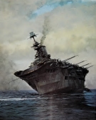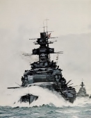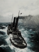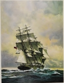 Full of the changing moods of the sea, the action of the ships and men who move with it, this artist's work is always exciting.