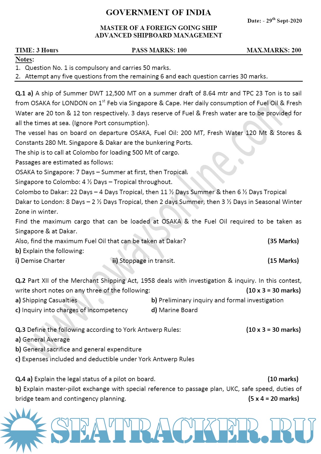 Question Paper Set for (ASM) Advanced Shipboard Management Writtens (September 2023) for Master's Examinations, Mercantile Marine Department (MMD), India