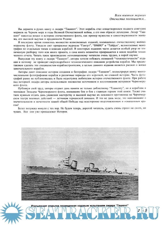 Описание истории создания и биографии лидера "Ташкент" с многочисленными фотографиями корабля в различные периоды его короткой, но славной истории. Часть фотографий ранее не публиковалась и была недоступна любителям истории отечественного флота.