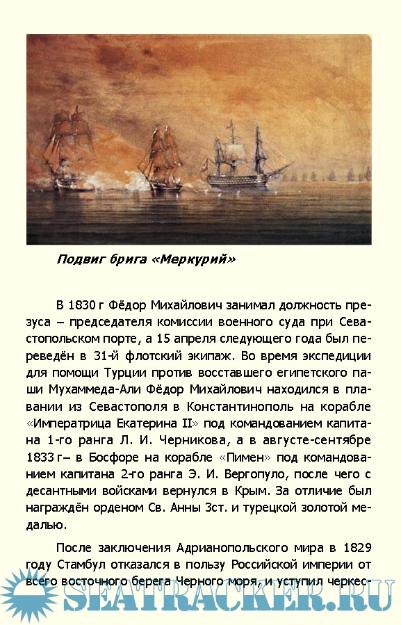 Дважды героем он стал в Синопском сражении, когда наравне с прославленным адмиралом Павлом Степановичем Нахимовым повёл свою половину эскадры в бой с превосходящим противником и победил прославив в веках своё имя и силу Русского оружия. Трижды героем Фёдор Михайлович стал в 1854 году на Севастопольских бастионах. Он командовал 4 бастионом, на самом опасном направлении. Это у него на бастионе служил молодой граф Лев Николаевич Толстой описавший впоследствии свои впечатления в «Севастопольских рассказах». Это он с товарищами водружал российские флаги и ставил первые гарнизоны в черноморских городах Туапсе, Сочи, Новороссийск. Помним! Гордимся! Потомству в пример!
