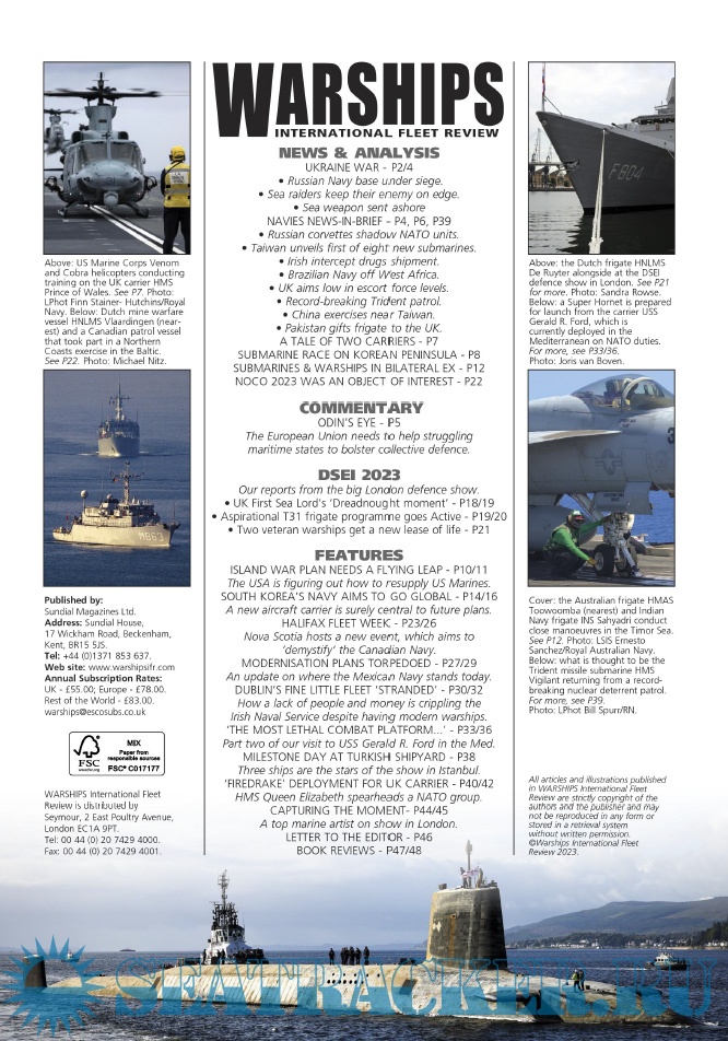 Year: 2023 Language: english Author: Iain Ballantyne (Editor) Genre: Periodical (magazine) Format: PDF Quality: eBook Pages count: 52 Description: Warships IFR puts the spotlight on the latest developments in the world’s navies. It covers current defence issues and has comments by leading analysts. The magazine regularly includes features on the Royal Navy and the US Navy in addition to incorporating news and features on all other navies across the globe. Warships IFR frequently carries in-depth articles on naval heritage.WARSHIPS International Fleet Review is published 12 times a year by Tandy Media Ltd who also publish Shipping Today & Yesterday (which provides news and features from the world of merchant shipping).