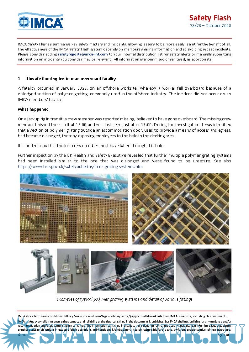 Year: 2023 Language: english Author: IMCA Genre: Periodical (magazine) Format: PDF Quality: eBook Pages count: multiple Description: The International Marine Contractors Association ( IMCA ) Safety Flashes disseminate important information on incidents and potential hazards and the lessons learnt from them that can help prevent incidents occurring elsewhere in the industry.IMCA Safety Flashes and systems for incident reporting and analysis are an important tool for sharing vital information.By publishing them, IMCA helps its members around the world identify potential hazards, share lessons learned and avoid repetition.Safety Flashes should be succinct, specific, factually correct and written in clear language.The Secretariat will assist with this through formatting and checking of the material submitted.