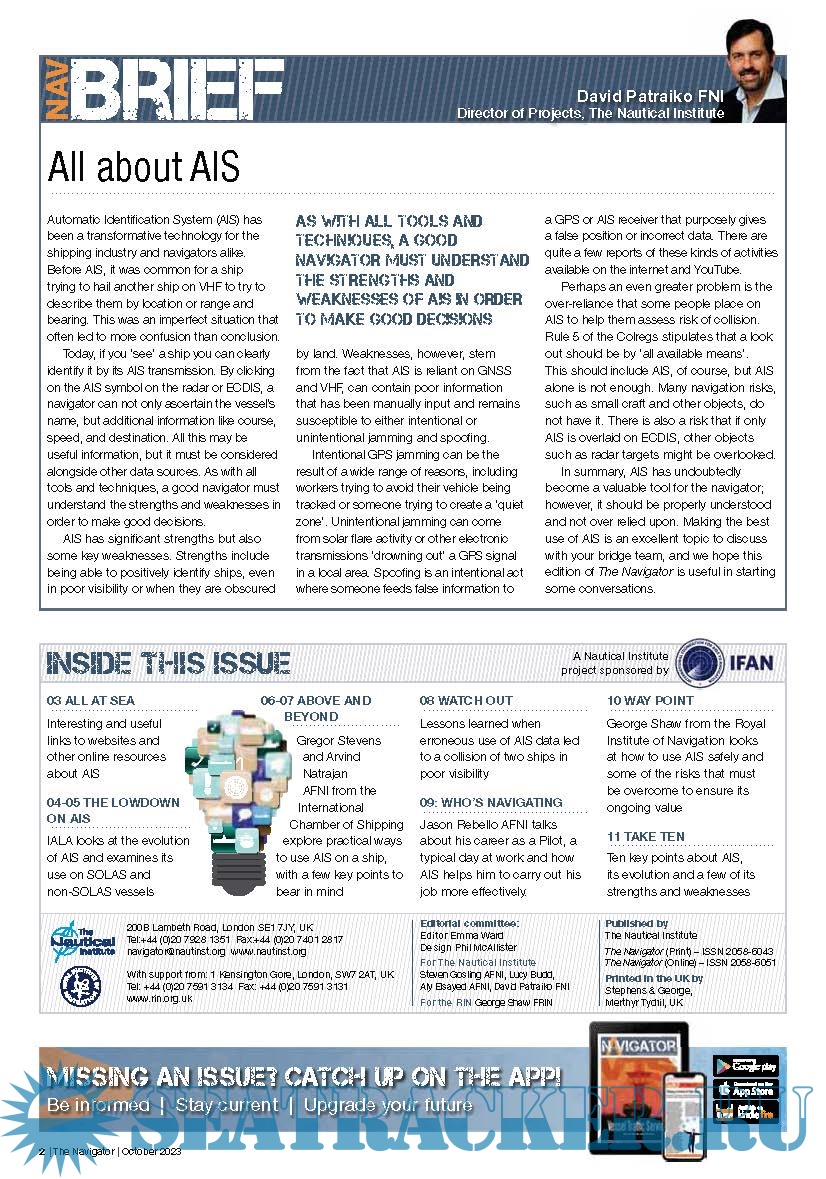 Year: 2023 Language: english Author: The Nautical Institute Genre: Periodical (magazine) Format: PDF Quality: eBook Pages count: 12 Description: Inspiring professionalism in marine navigators! The Navigator a publication from The Nautical Institute that champions the role of today's professional marine navigators. Published in association with the Royal Institute of Navigation. issue no. 34 dated October, 2023