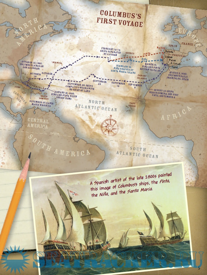 Description: In the late 1400s, Christopher Columbus was sure he could find a trade route from Spain to the Far East by sailing west across the Atlantic Ocean. On his first voyage, he landed on an island in the Caribbean Sea. He soon realizedn that this was not Asia and returned to Spain for more supplies. Even after three more attempts, Columbus never found a westward route to Asia. But his discoveries forever changed European views of the world and led to settlement in the Americas.