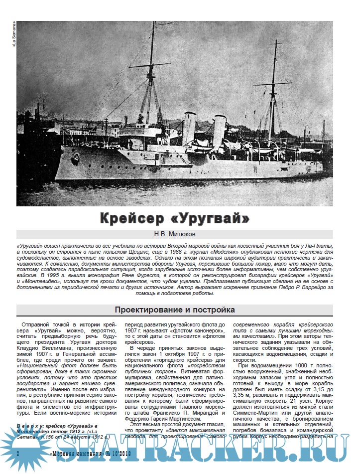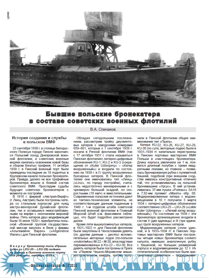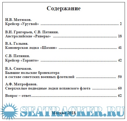 В него вошли статьи об уругвайском крейсере «Уругвай» (часто называемом канонерской лодкой); австралийских эсминцах типа «Парраматта» (также известных как тип «Австралийский «Ривер»); германской канонерской лодке «Шамин», служившей в китайских водах; итальянском крейсере «Таранто» (бывшем германском «Страсбург») ;бывших польских речных бронекатерах, доставшихся Советскому Союзу в качестве трофеев и служивших в составе Пинской, а затем – Днепровской военных флотилий; сверхмалых подводных лодках испанского флота.