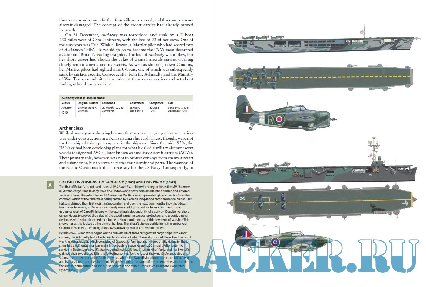 Year: 2019 Language: english Author: Angus Konstam Genre: History Publisher: Osprey Publishing Edition: Osprey New Vanguard 274 Format: PDF Quality: eBook Pages count: 49 Description: This is the fully-illustrated story of the Royal Navy's escort carriers which battled against deadly U-Boats during the Battle of the Atlantic, giving vital air cover to the convoys that kept Britain alive in World War II. In 1941, as the Battle of the Atlantic raged and ship losses mounted, the British Admiralty desperately tried to find ways to defeat the U-Boat threat to Britain's maritime lifeline. Facing a shortage of traditional aircraft carriers and shore-based aircraft, the Royal Navy, as a stopgap measure, converted merchant ships into small “escort carriers.” These were later joined by a growing number of American-built escort carriers, sent as part of the Lend-Lease agreement. The typical Escort Carrier was small, slow and vulnerable, but it could carry about 18 aircraft, which gave the convoys a real chance to detect and sink dangerous U-Boats. Collectively, their contribution to an Allied victory was immense, particularly in the long and grueling campaigns fought in the Atlantic and Arctic. Illustrated throughout with detailed full-color artwork and contemporary photographs, this fascinating study explores in detail how these adaptable ships had such an enormous impact on the outcome of World War II's European Theater.