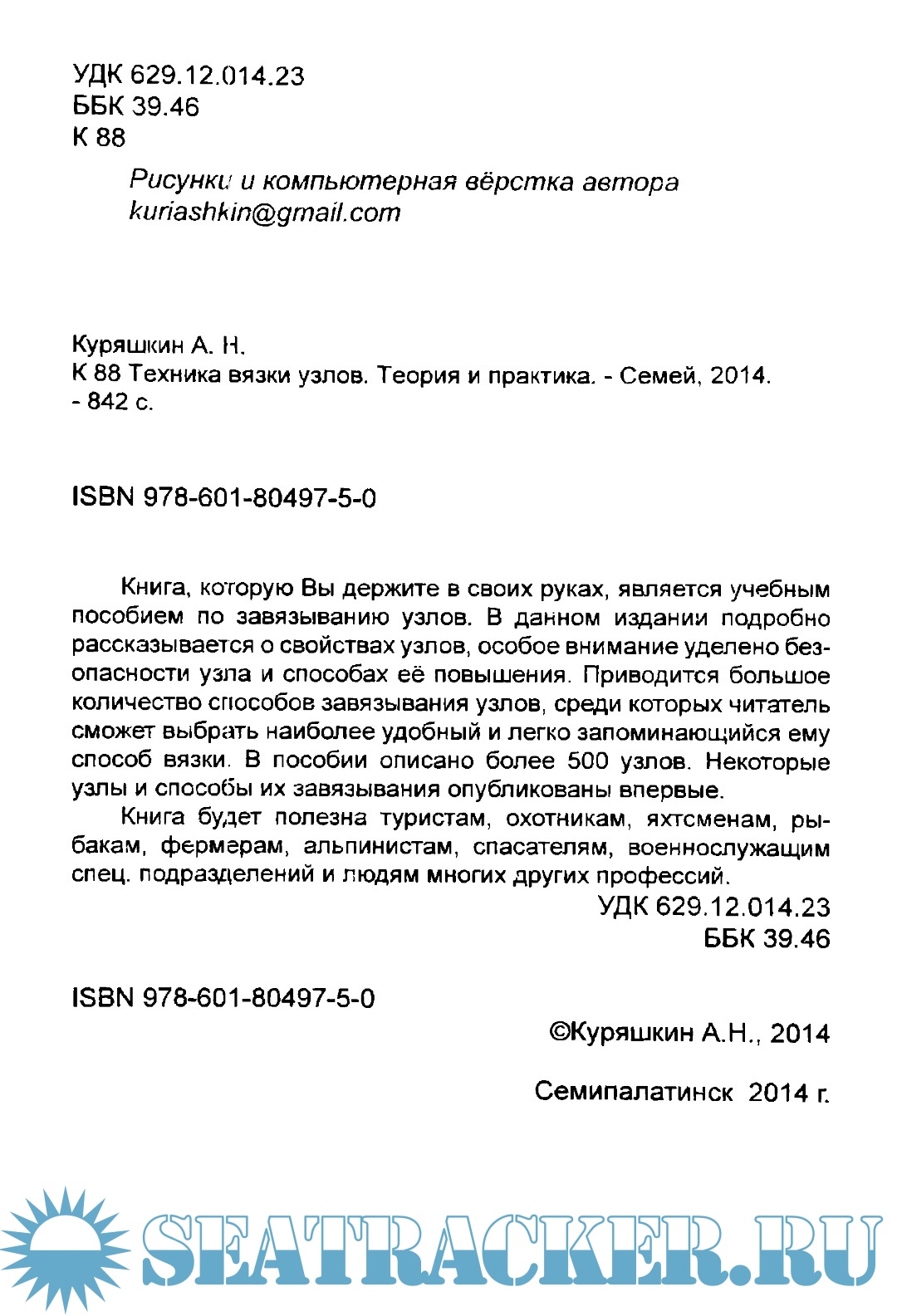 Описание: Книга, которую вы читаете, написана казахстанцем Андреем Николаевичем Куряшкиным и является учебным пособием по завязыванию узлов. Здесь представлен не обрубок книги, гуляющий с 2014 года на просторах интернета, а полновесное издание книги, от А до Я. В данном издании подробно рассказывается о свойствах узлов, особое внимание уделено безопасности узла и способах её повышения. Приводится большое количество способов завязывания узлов, среди которых читатель сможет выбрать наиболее удобный и легко запоминающийся ему способ вязки. Андрей Николаевич даёт глубокий анализ способов завязывания узлов, разбирает достоинства и недостатки узловых конструкций, Даёт крайне интересные исторические ракурсы событий. В данном монументальном труде описано свыше 500 узлов. Некоторые узлы и способы их завязывания опубликованы впервые. Книга будет полезна туристам, охотникам, яхтсменам, рыбакам, фермерам, альпинистам, спасателям, военнослужащим спец. подразделений и просто думающим людям многих других профессий.