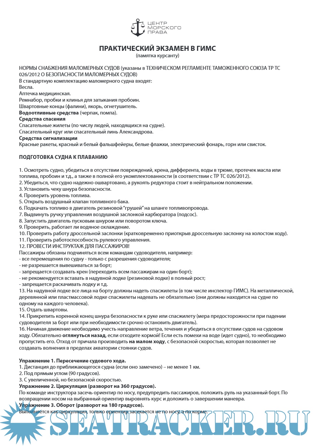 Описание: Памятка курсанту для практического экзамена в ГИМС (моторное судно), подготовленная Центром морского права.