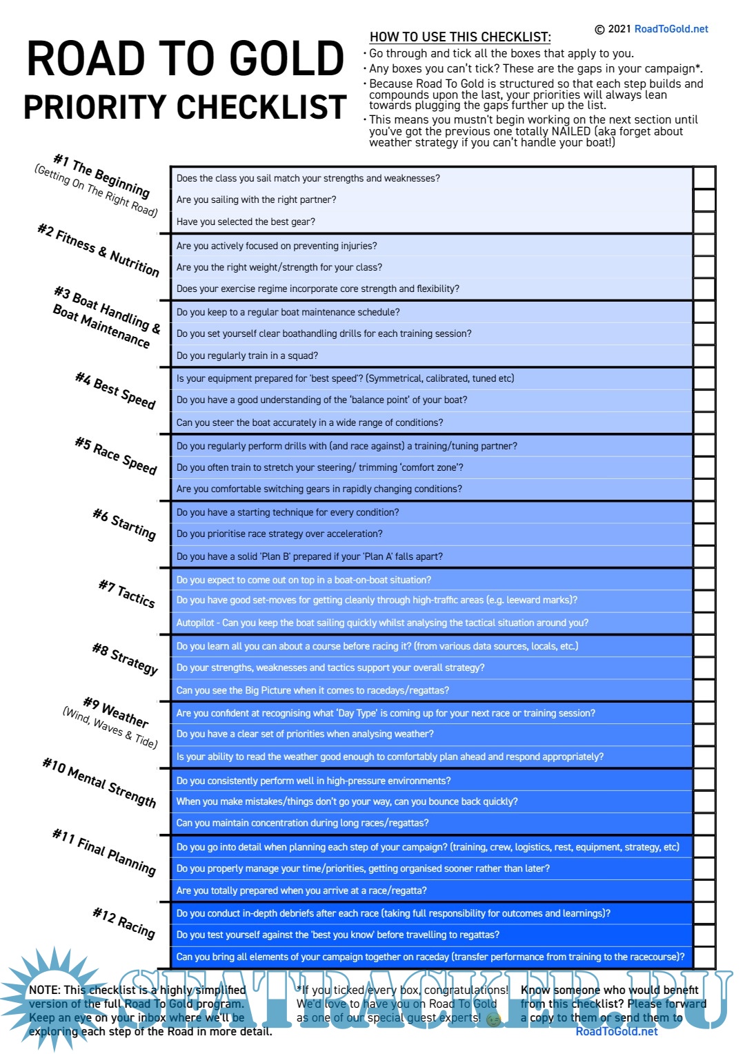 For now we recommend just checking out the first part: the Road To Gold Priority Checklist. Over 36 simple questions, we take you through the same structure that Hamish Willcox developed while coaching sailors to podium success at eight Olympic Games, including Pete Burling & Blair Tuke’s 49er gold medal at Rio 2016.