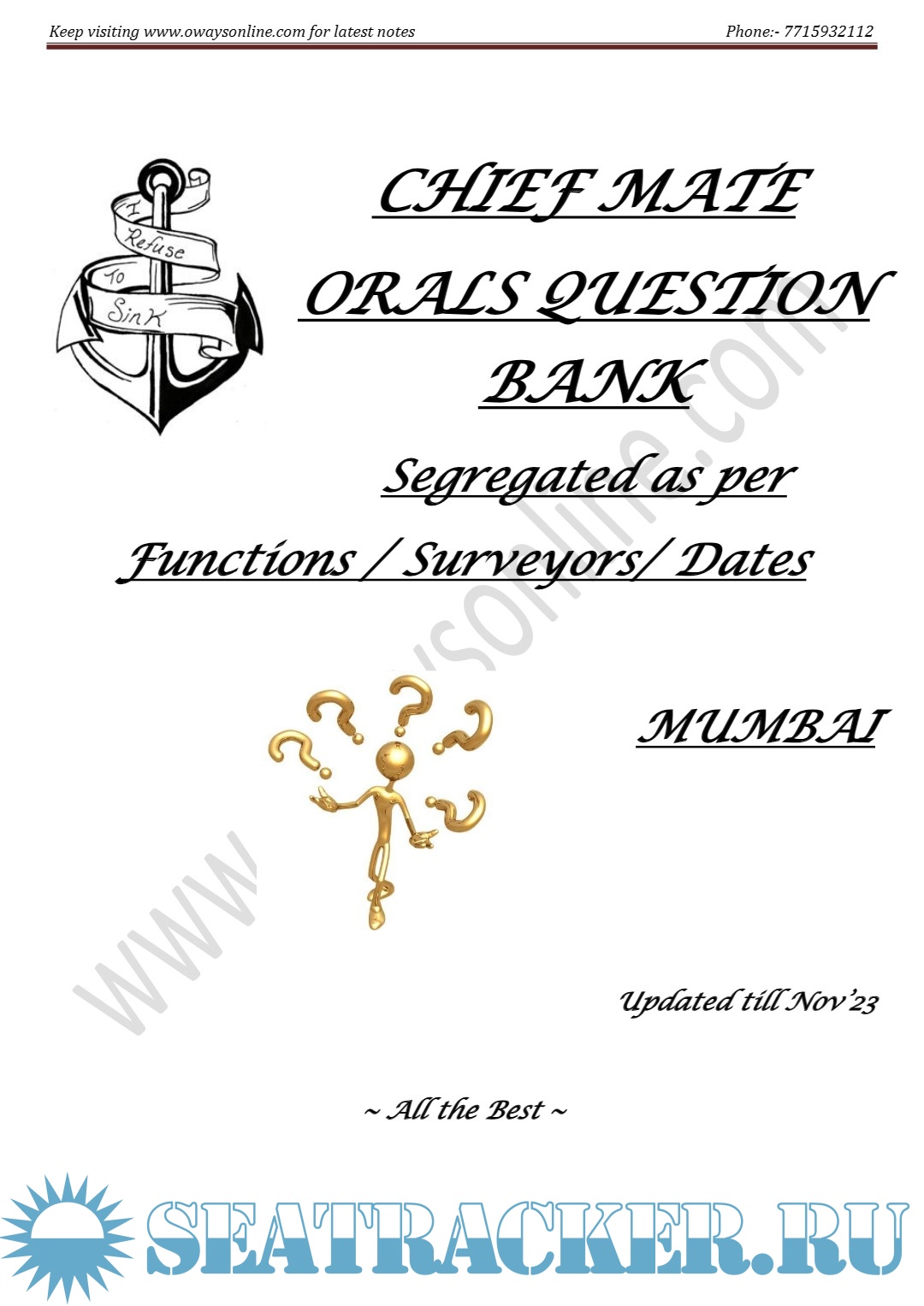 Year: 2023 Language: english Author: Oways Online Format: PDF Quality: eBook Pages count: 273 Description: Orals Question Bank for Chief Mate F.G. Mercantile Marine Department (MMD), India Examinations. Segregated as per Functions / Surveyors/ Dates.Mumbai Surveyors.