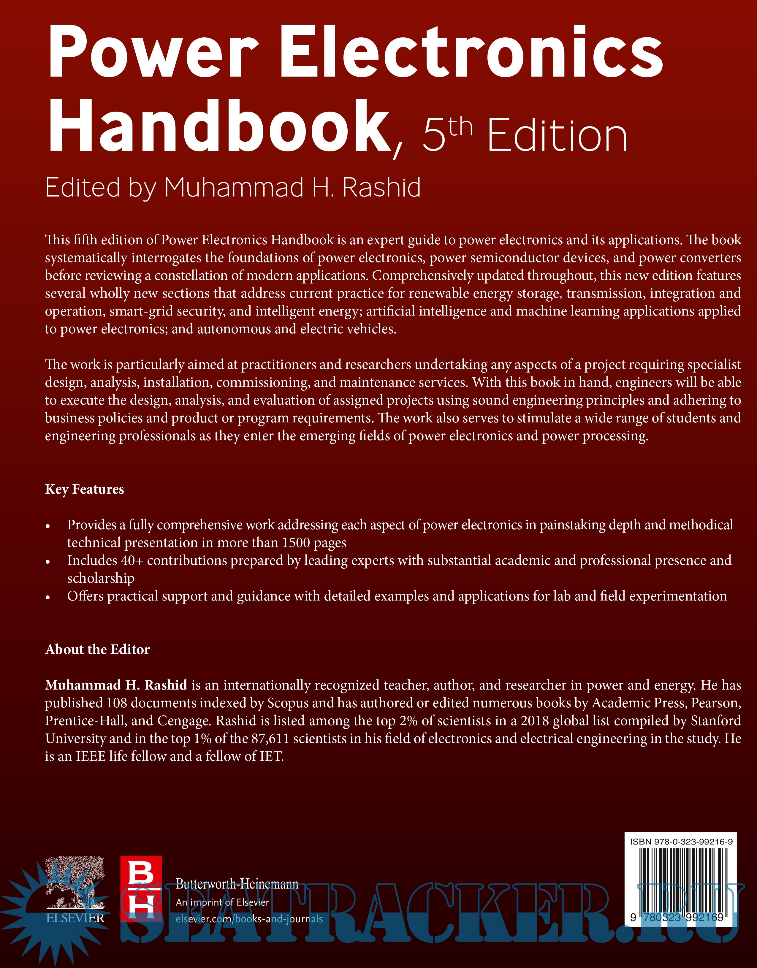 Year: 2024 Language: english Author: Muhammad H. Rashid Genre: Handbook Publisher: Butterworth-Heinemann Edition: 5th (September 27, 2023) ISBN: 9780323992169 Format: PDF Quality: eBook Pages count: 1472 Description: Power Electronics Handbook, Fifth Edition delivers an expert guide to power electronics and their applications. The book examines the foundations of power electronics, power semiconductor devices, and power converters, before reviewing a constellation of modern applications. Comprehensively updated throughout, this new edition features new sections addressing current practices for renewable energy storage, transmission, integration, and operation, as well as smart-grid security, intelligent energy, artificial intelligence, and machine learning applications applied to power electronics, and autonomous and electric vehicles. This handbook is aimed at practitioners and researchers undertaking projects requiring specialist design, analysis, installation, commissioning, and maintenance services. Key Features: • Provides a fully comprehensive work addressing each aspect of power electronics in painstaking depth • Delivers a methodical technical presentation in over 1400 pages • Includes 50+ contributions prepared by leading experts • Offers practical support and guidance with detailed examples and applications for lab and field experimentation • Includes new technical sections on smart-grid security and intelligent energy, artificial intelligence, and machine learning applications applied to power electronics and autonomous and electric vehicles • Features new chapter level templates and a narrative progression to facilitate understanding :