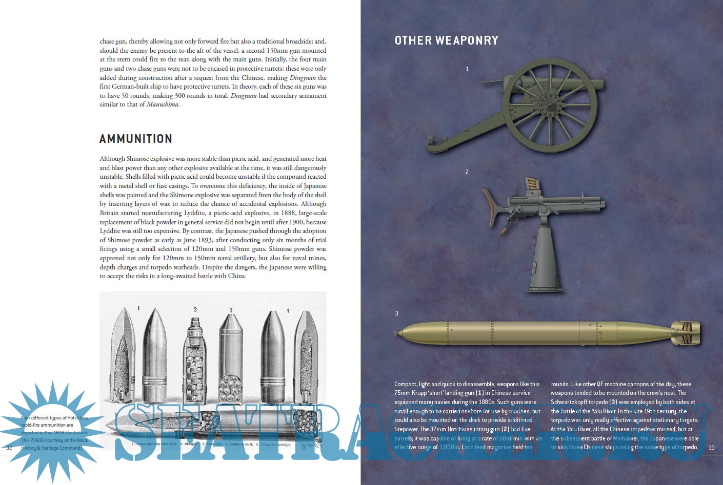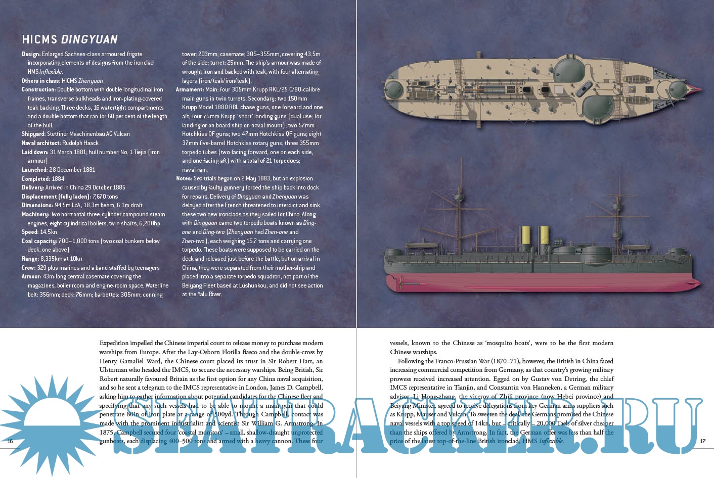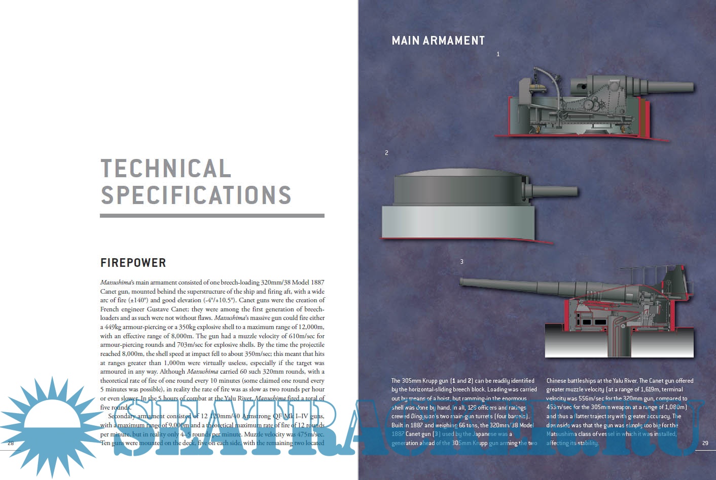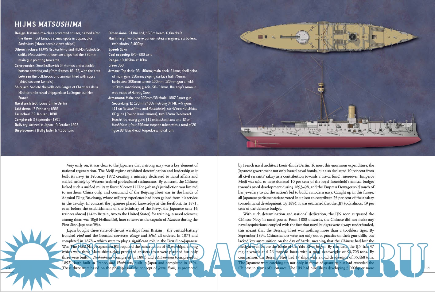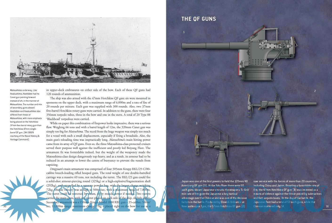 The Chinese Beiyang (Northern) Fleet was led by her flagship, Dingyuan, and her sister ship, Zhenyuan, which were the biggest in Asia; German-built armored turret ships, they were armed with four 12in guns and two 6in guns, plus six smaller guns and three torpedo tubes. For their part the Japanese fleet, including the Matsushima and her sister ships Itsukushima and Hashidate, were each armed with a single 12.6in Canet gun and 11 or 12 4.7in guns, plus smaller guns and four torpedo tubes. The scene was set for a bloody confrontation that would stun the world and transform the relationship between China and Japan.